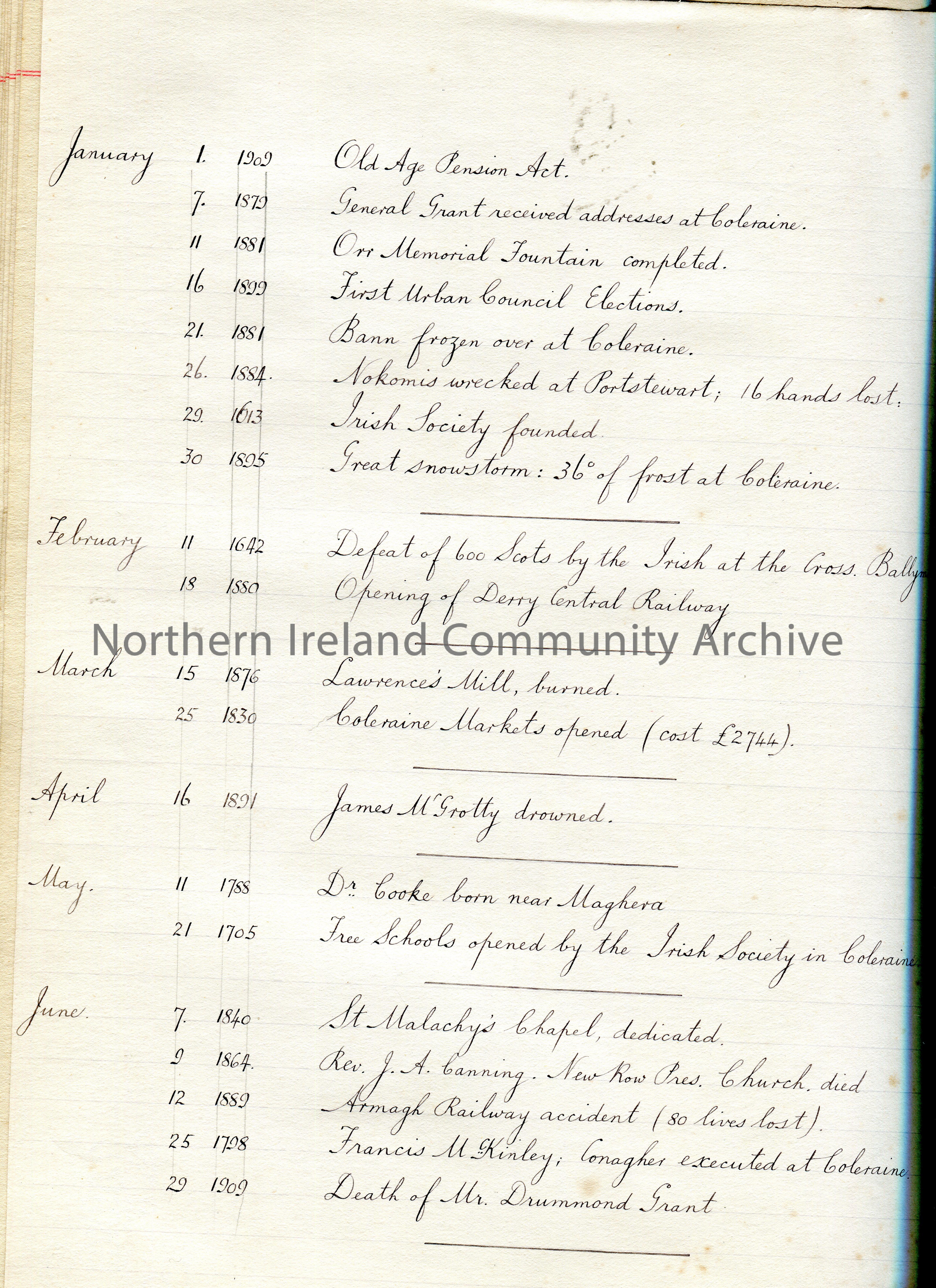 Handwritten list of local events by month. 17th to 20th century. Coleraine, Ballymoney, Portrush, Portstewart, railway developments.