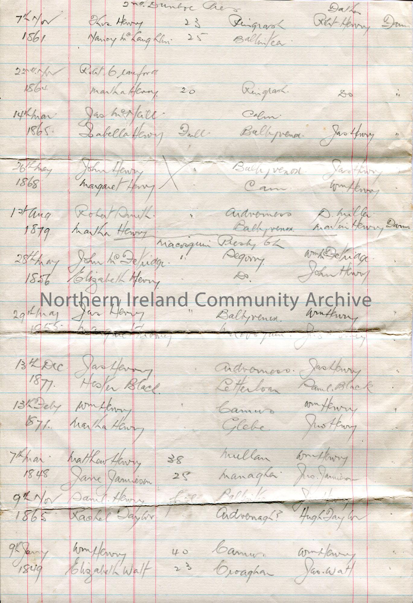Handwritten list of marriages on large, lined paper (folded) of 19th century dates and names. Titled, '2nd Dunboe Pres' [Presbyterian Church, Coleraine]. This was family history research by Sam for Ada Henry Bridge based in Connecticut, U.S.A. All of the marriages have either the bride or groom with surname Henry.