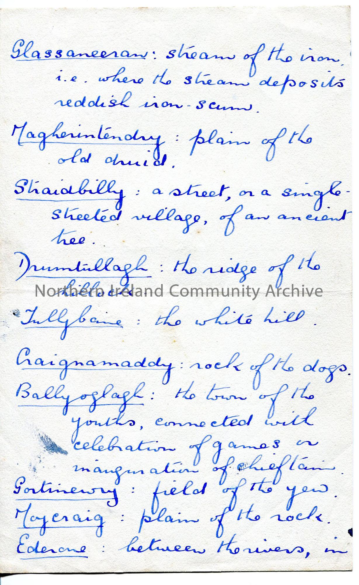 Handwritten list of placenames and their meanings. Includes Coleraine and Garvagh.