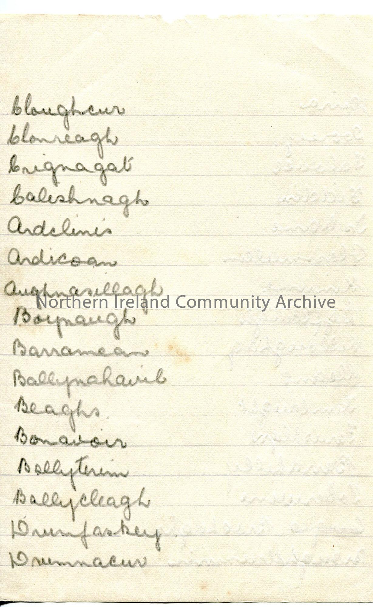 Handwritten list of placenames – no context or meaning