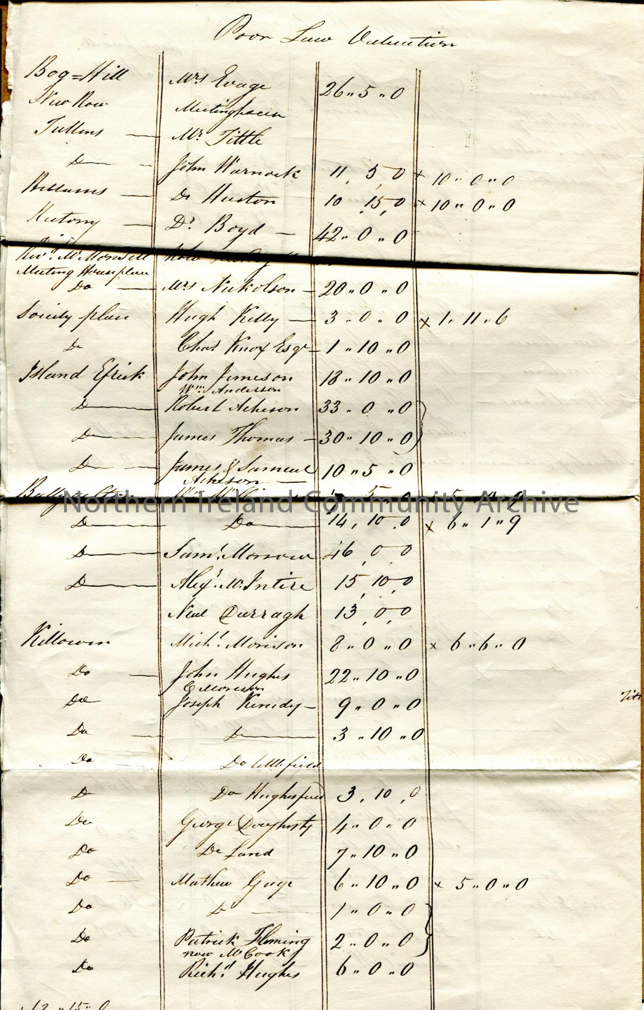 Handwritten list of Poor Law Valuation on double page - names and amounts, with locality in left hand column e.g.Killowen, New Row, Ballysally, Loguestown, Woodburn, Society Place, Meetinghouse Place.