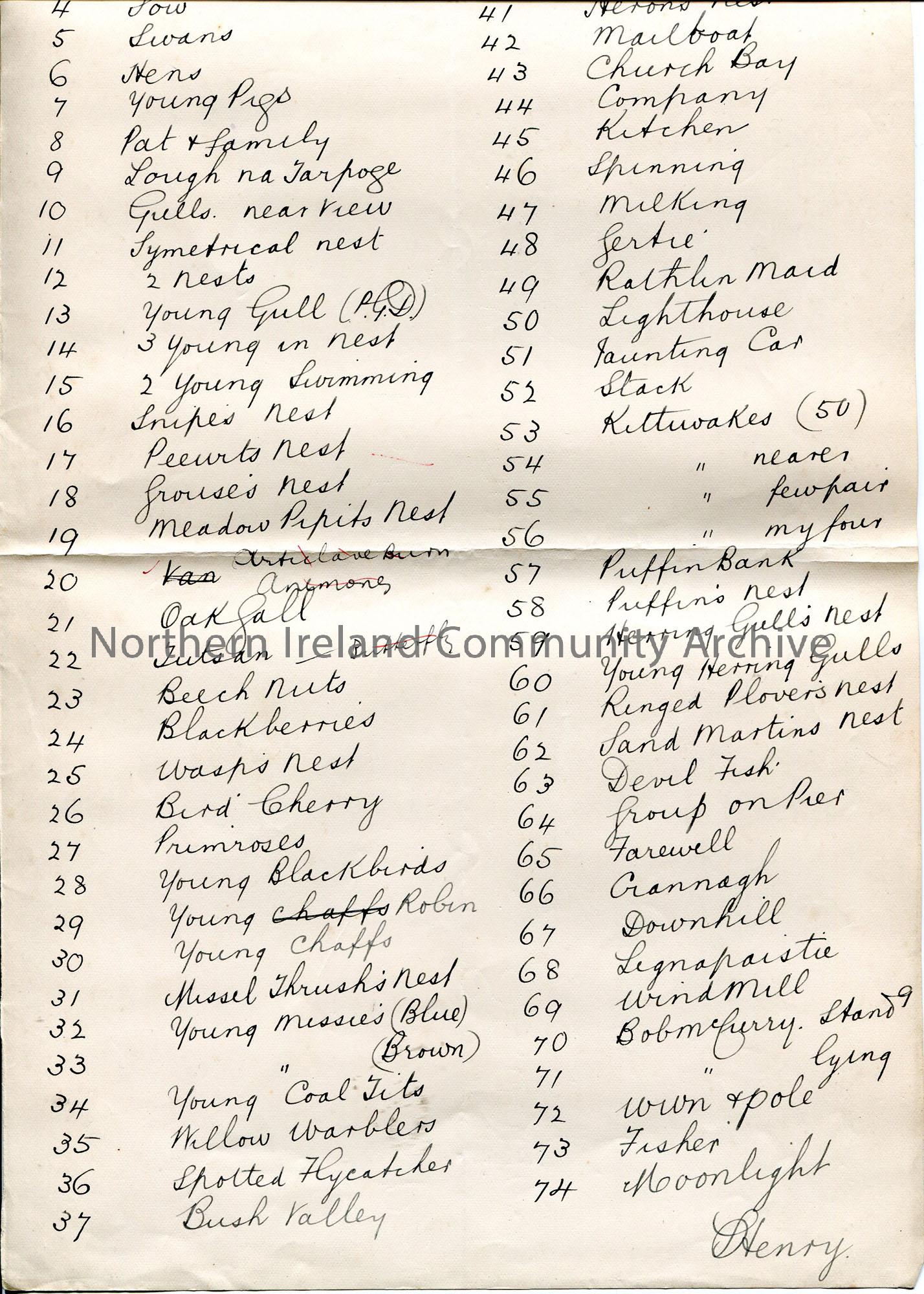 Handwritten list of slides for Portstewart Lecture on 27th March 1908. Numbered 1-74 and signed by Sam Henry. The majority of names appear to be bird … – scan003b
