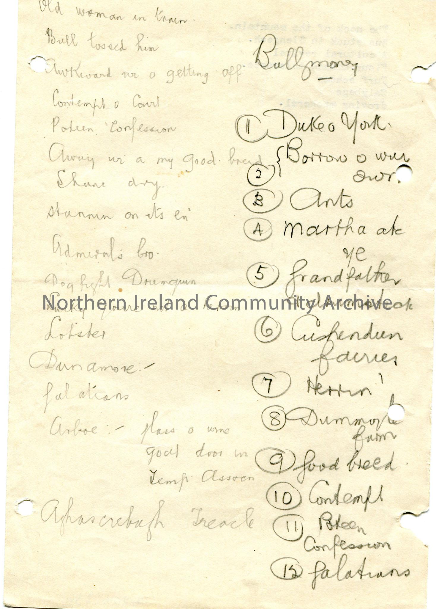 Handwritten list of words, some are numbered 1-12. Typed list on one side of page.