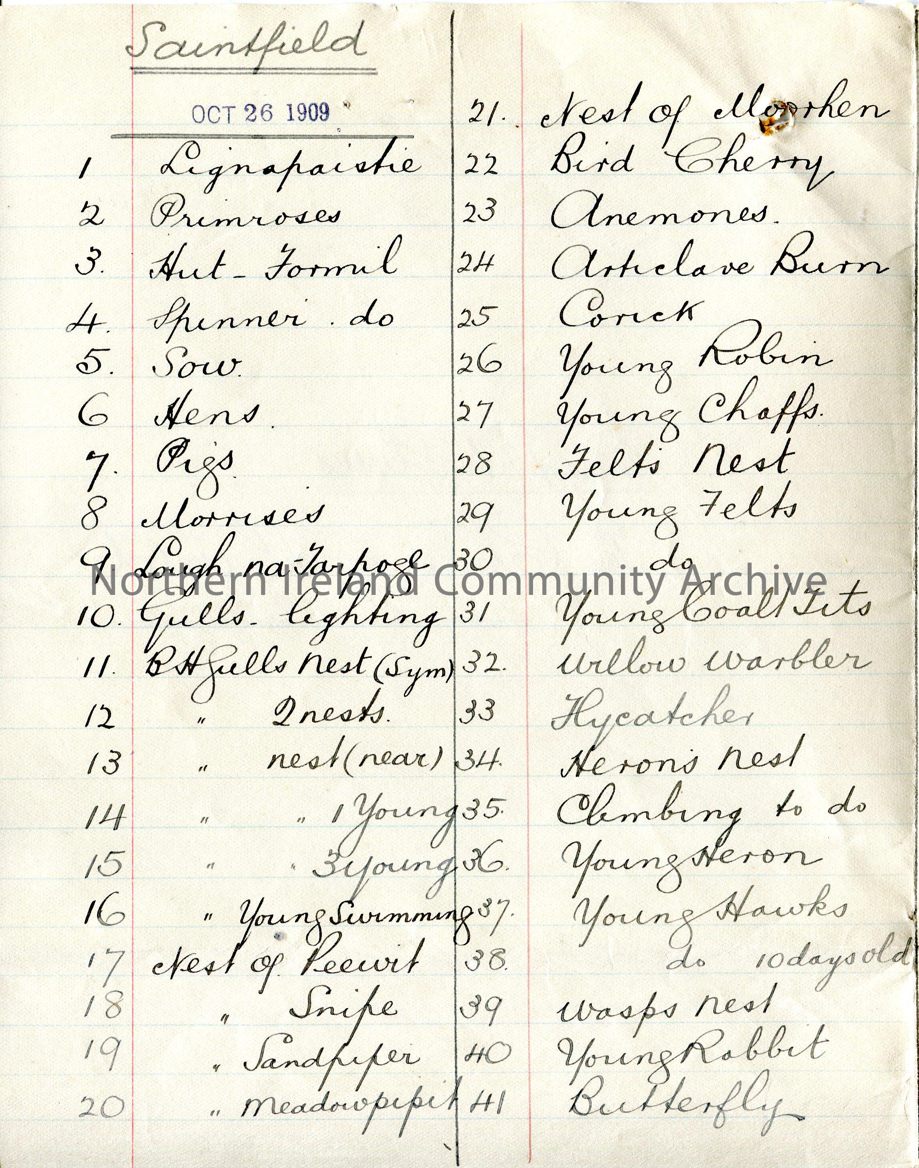 Handwritten list on folded page titled, 'Index to Slides. The Charm of the Wild'. The slides were used within a lecture given by Sam Henry at First Saintfield Guild on 26th October 1909. List of 68 slide names, the majority of which are bird names.