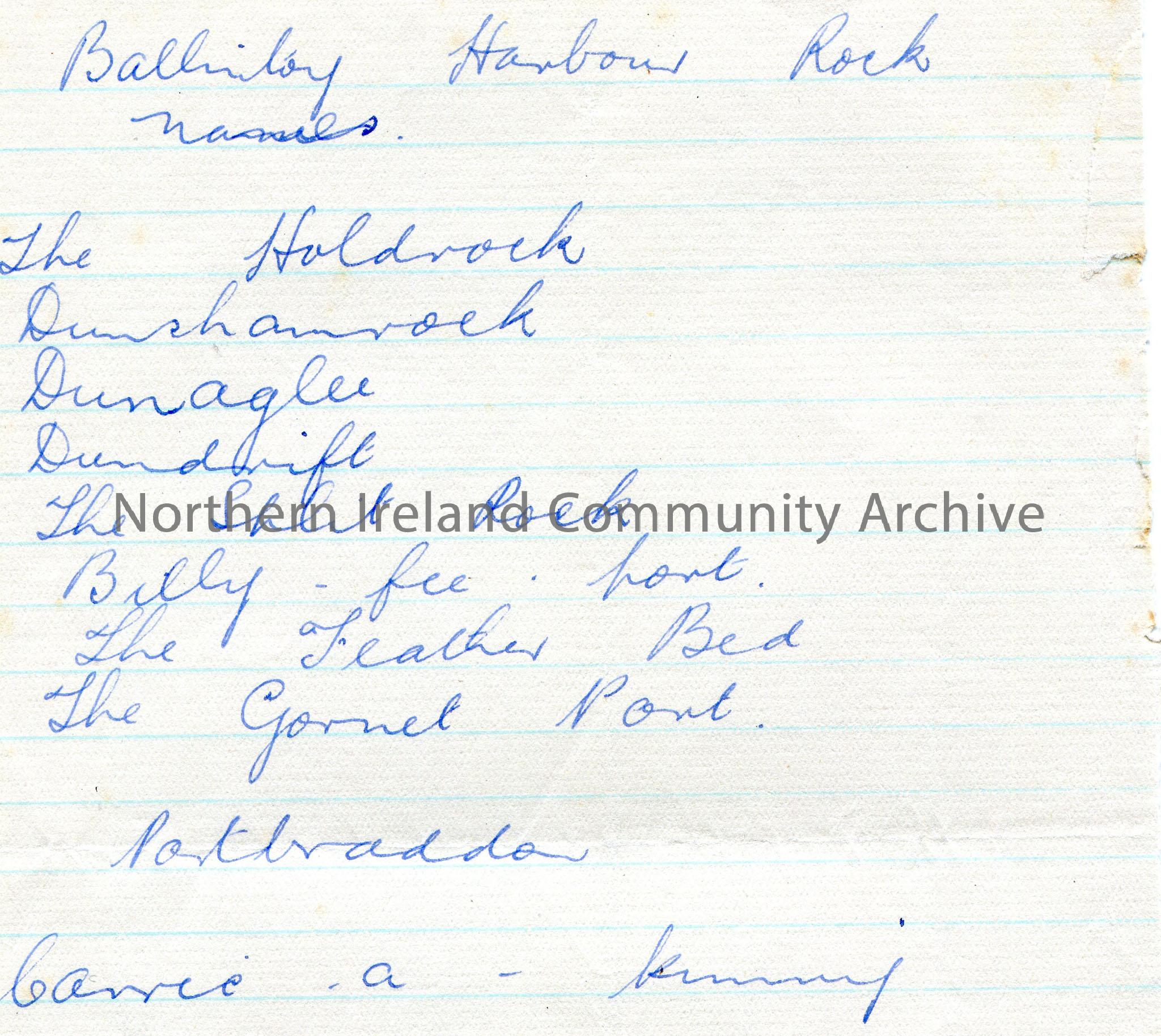 Handwritten list titled ‘Ballintoy Harbour Rock names’.