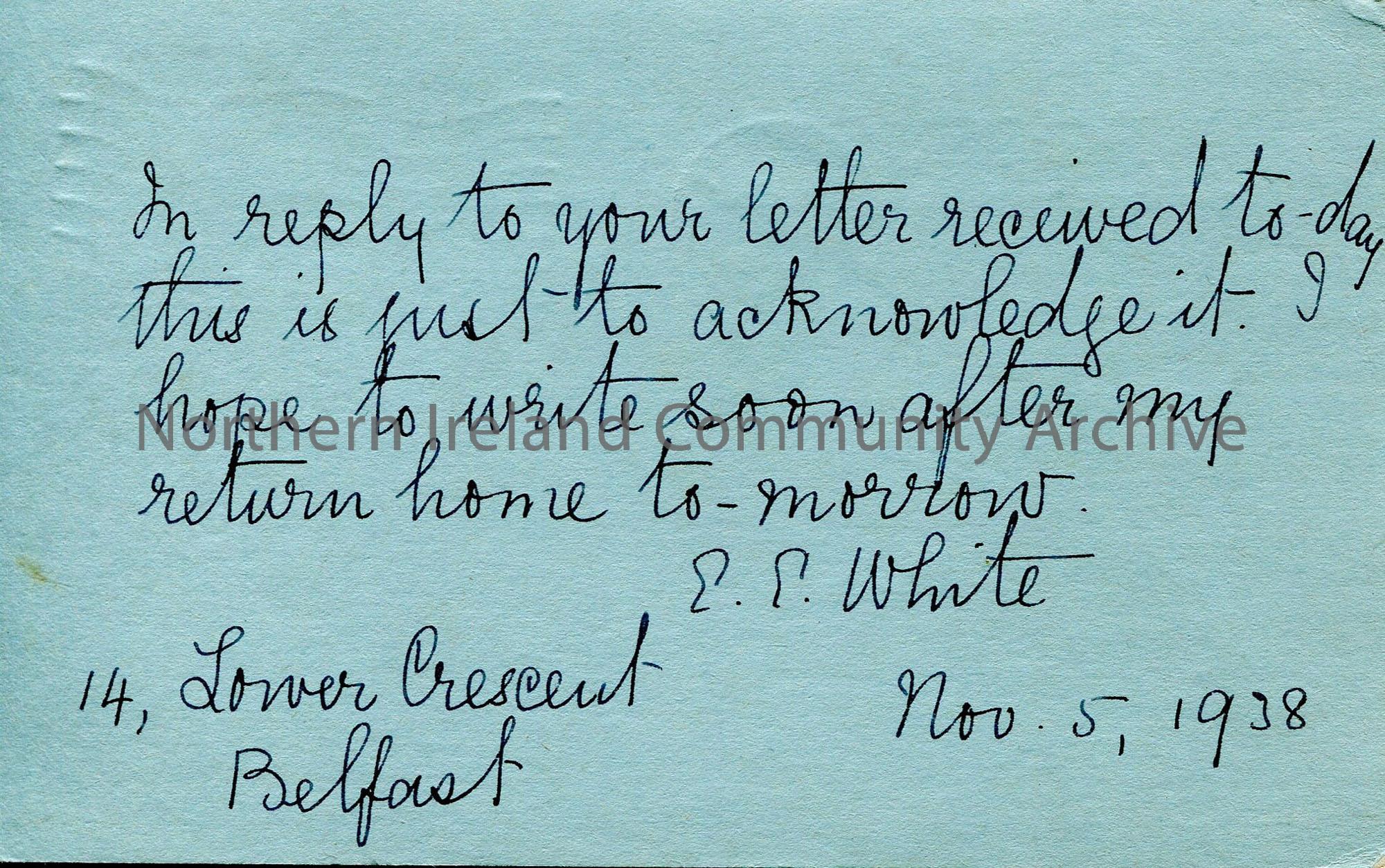Handwritten message on postacrd, acknowledging receipt of letter and promise to reply