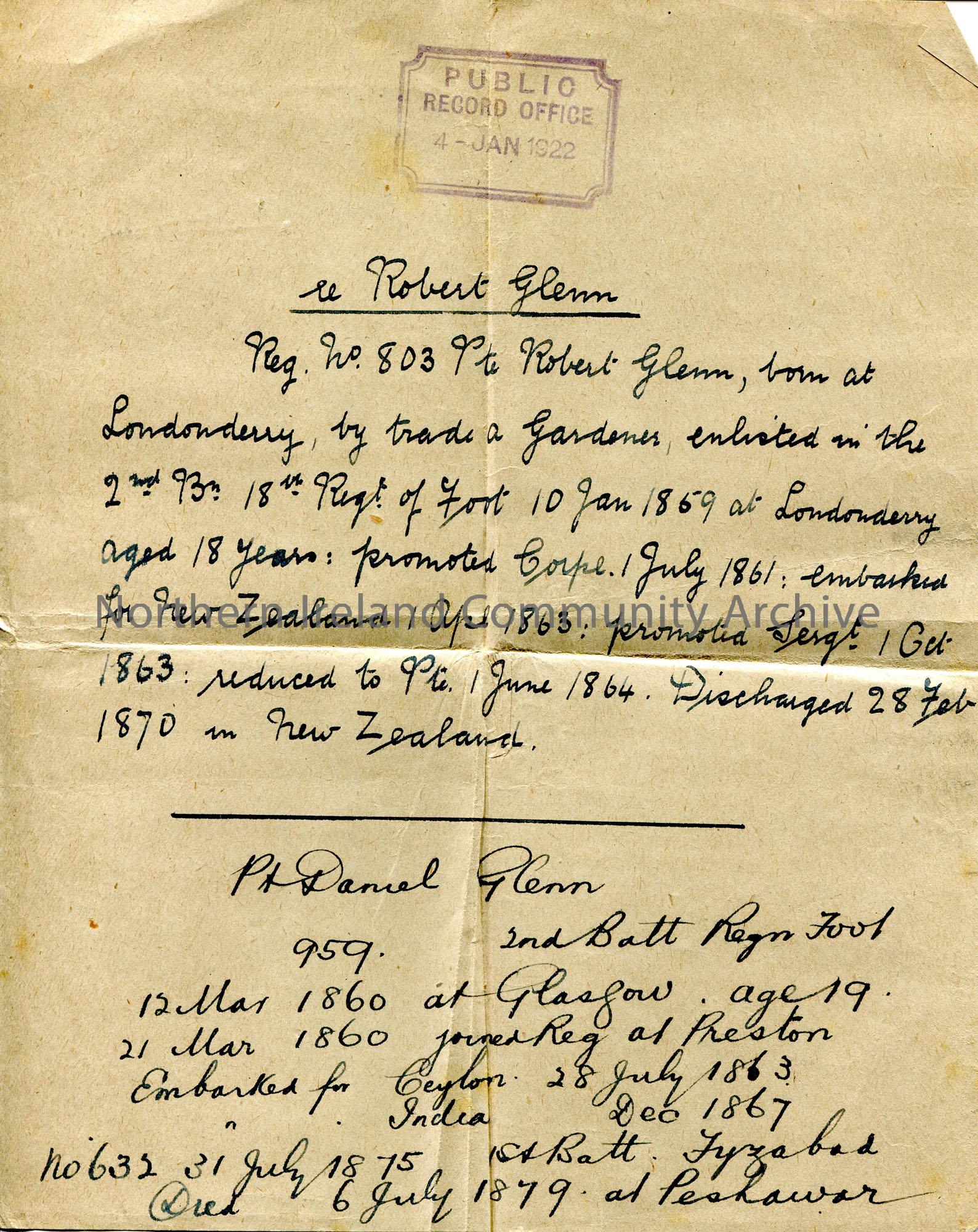 Handwritten military records of Private Robert Glenn of Londonderry and Private Daniel Glenn of Scotland. From Public Record Office, 4th January, 1922.