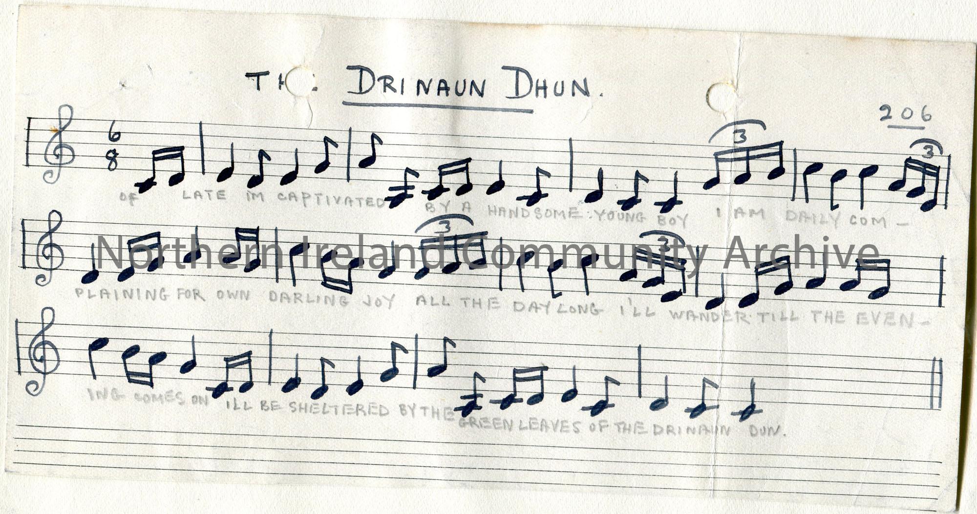 Handwritten musical notes and words to song on manuscript paper. Song titled, ‘The Drinaun Dhun’.