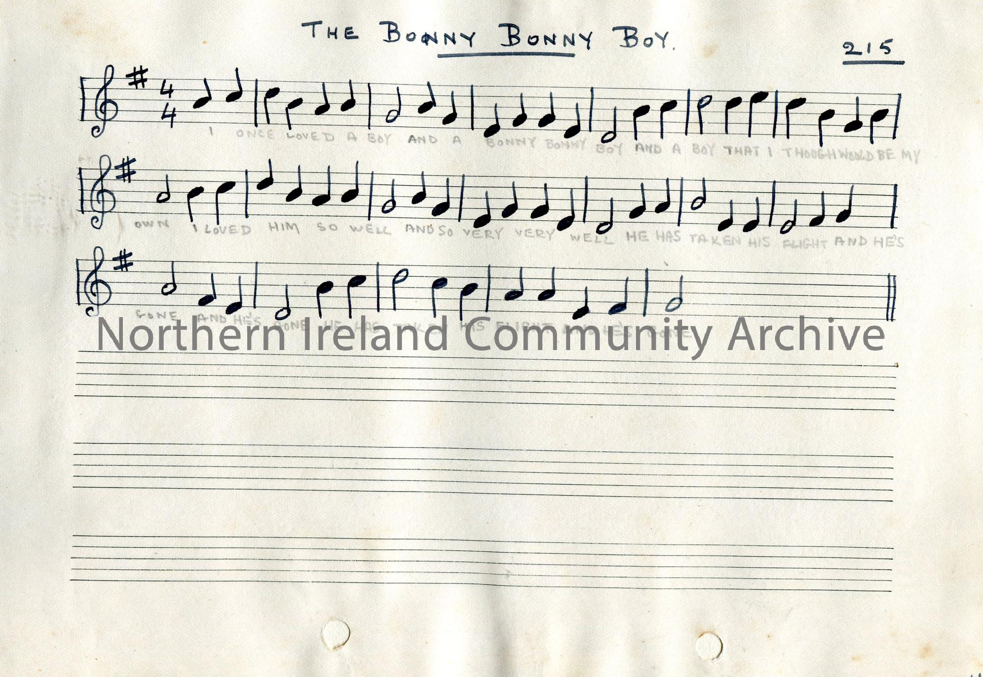 Handwritten musical notes and words to song titled, ‘The Bonny, Bonny Boy’. Numbered 215.