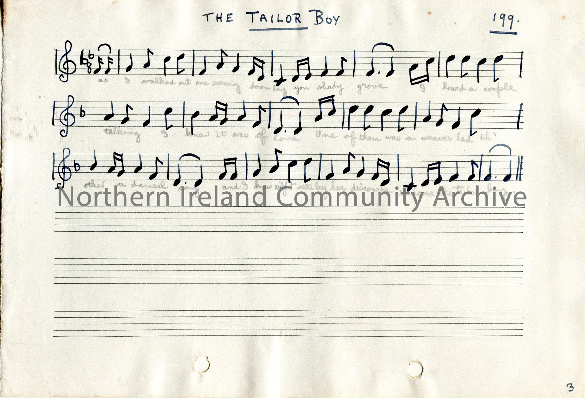 Handwritten musical notes and words to song titled, ‘The Tailor Boy’. Numbered 199.