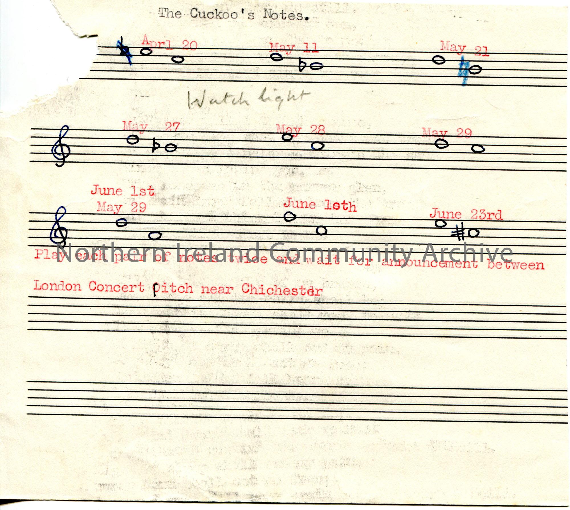 Handwritten musical notes on manuscript paper titled, 'The Cuckoo's Notes'. Dates are typed above each set of notes of which there are nine. Typed note in red which reads, 'Play each pair of notes twice and wait for announcement between London Concert pitch near Chichester. 'Watch light' handwritten in pencil between notes.
