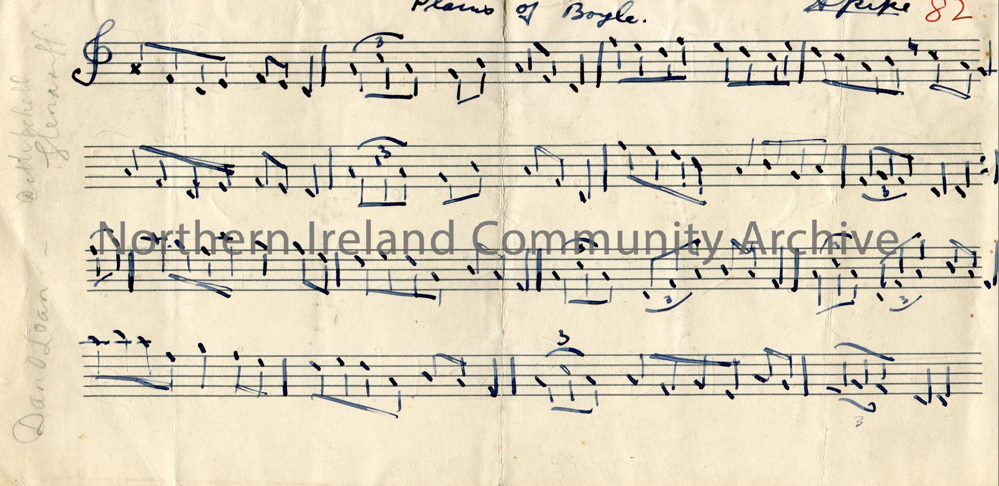 Handwritten musical notes to 'Plains of Boyle'. H.Pike. One version is in pen and the other in pencil on both sides of the page. 'Dan O'Loan - Glenariff' written in pencil.