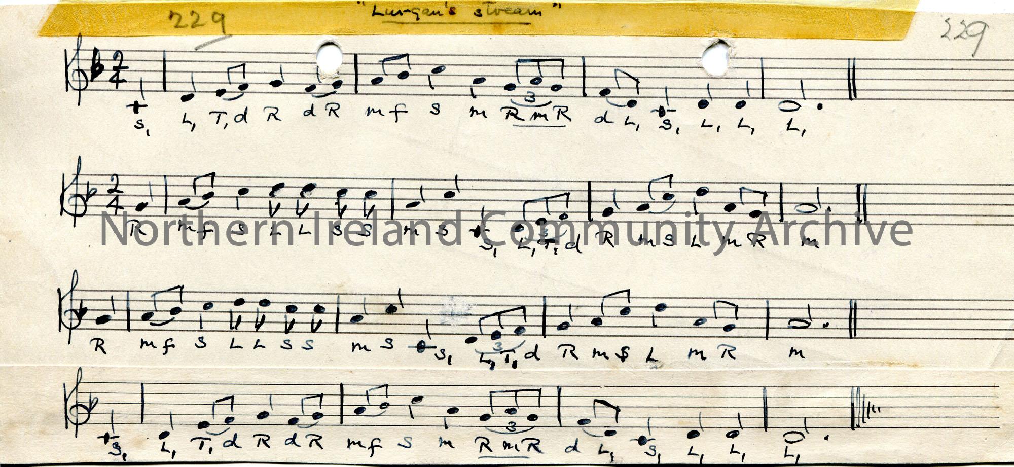 Handwritten musical notes to song on manuscript paper titled, ‘Lurgan’s Stream’. Numbered 229. [Lurgan Stream]