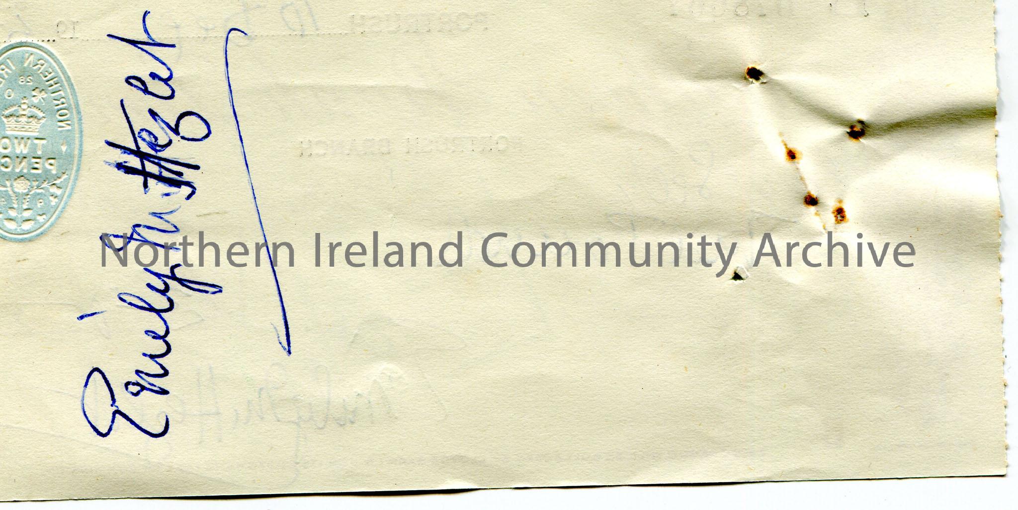 Handwritten Northern Bank Limited, Portrush branch cheque, no 078667. Payable to ‘Self’ from Emily M. Hezlet for £3.0.0. Dated 10th December, 195… – scan322b