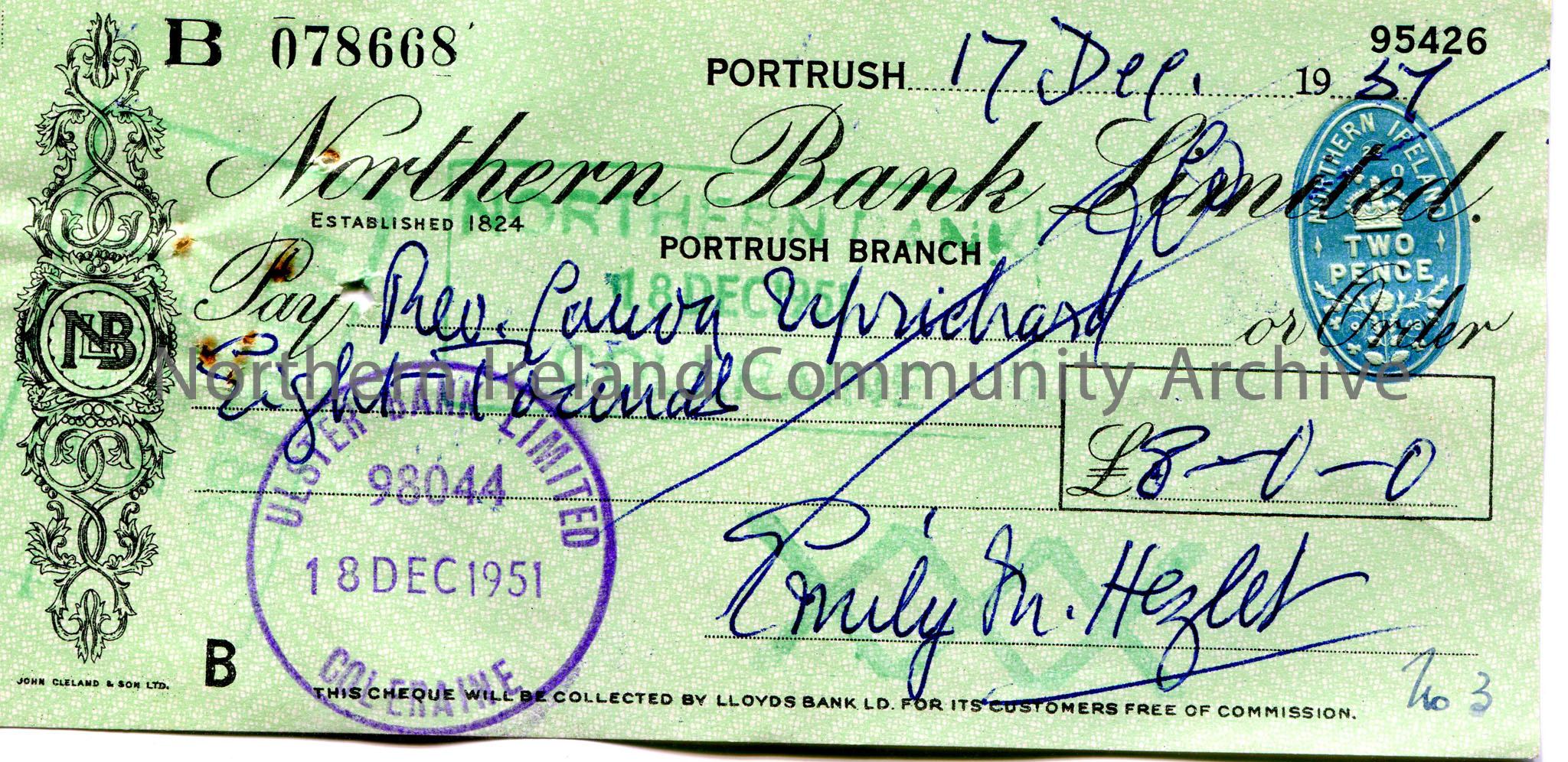 Handwritten Northern Bank Limited, Portrush branch cheque, no 078668. Payable to Rev Canon Uprichard from Emily M. Hezlet for £8.0.0. Dated 17th December, 1957. Northern Bank, Coleraine and Ulster Bank, Coleraine stamps on front dated 18th December, 1951. L. V. Uprichard signature on reverse.
