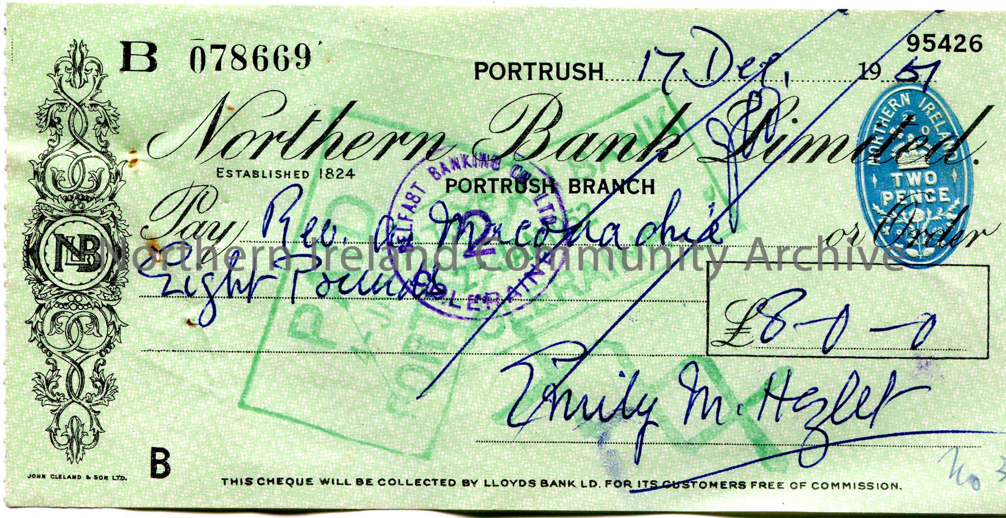 Handwritten Northern Bank Limited, Portrush branch cheque, no 078669. Payable to Rev A. Maconachie from Emily M. Hezlet for £8.0.0. Dated 17th December, 1957. Northern Bank, Coleraine stamp dated 2nd January 1952 and Paid stamp dated 4th January on front. A. Maconachie signature on reverse along with Belfast Banking Co, Coleraine stamp.