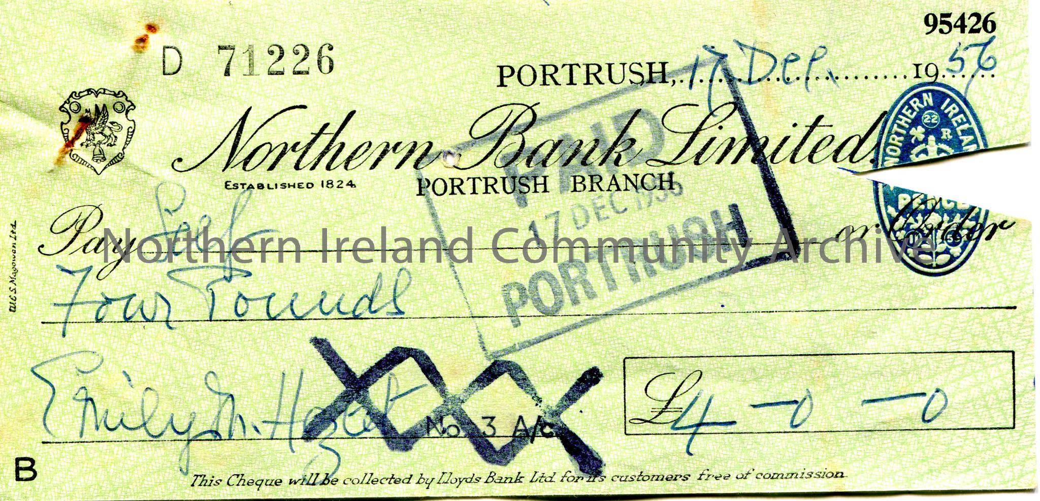 Handwritten Northern Bank Limited, Portrush branch cheque, no 71226. Payable to ‘Self’ from Emily M. Hezlet for £4.0.0. Dated 17th December, 1956…