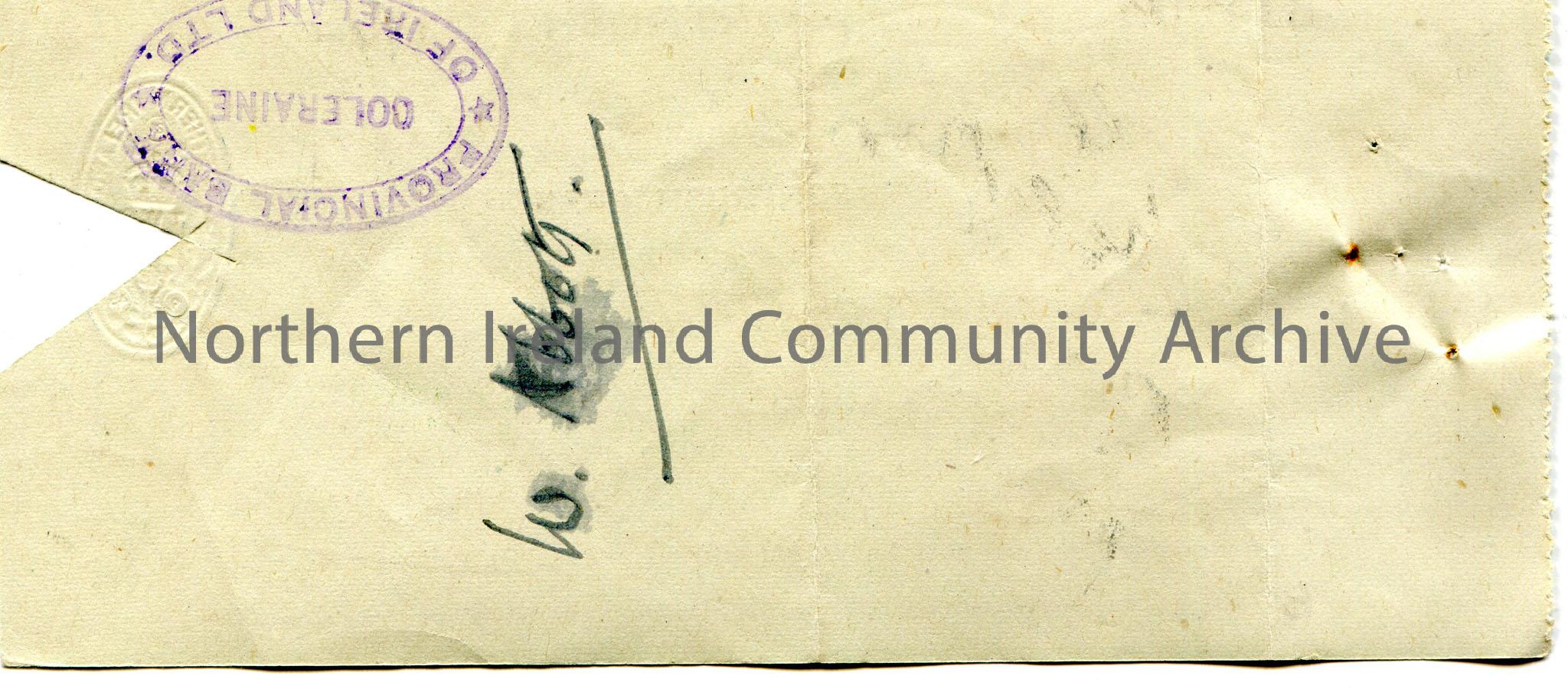 Handwritten Northern Bank Limited, Portrush branch cheque, no B14902. Payable to Rev. W. Abbott from Emily M. Hezlet for £10.0.0. Dated 11th November, 1945. W. Abbott signature on reverse along with Provincial Bank of Ireland, Coleraine branch stamp. Triangle cut from edge of cheque.