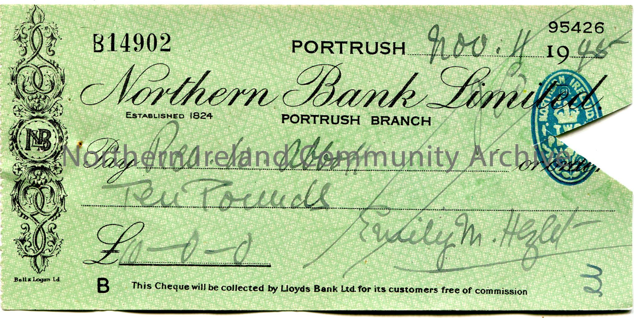 Handwritten Northern Bank Limited, Portrush branch cheque, no B14902. Payable to Rev. W. Abbott from Emily M. Hezlet for £10.0.0. Dated 11th Nove…