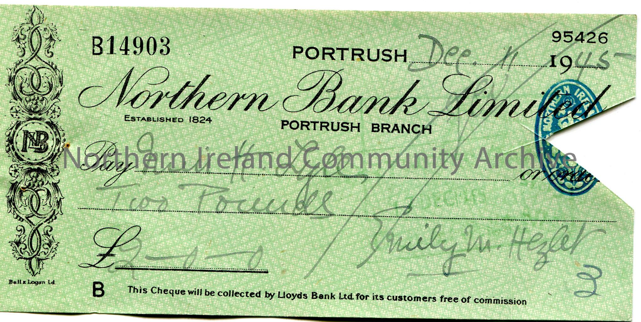 Handwritten Northern Bank Limited, Portrush branch cheque, no B14903. Payable to Miss H. Lyle from Emily M. Hezlet for £2.0.0. Dated 11th December, 1945. Harriette Lyle signature on reverse along with Provincial Bank of Ireland, Coleraine branch stamp. Triangle cut from edge of cheque.