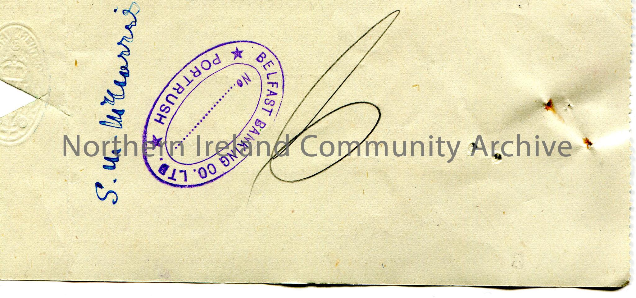 Handwritten Northern Bank Limited, Portrush branch cheque, no B14906. Payable to Mrs McMorris (Nourishment Fund District ? Association) from Emily M. … – scan332b