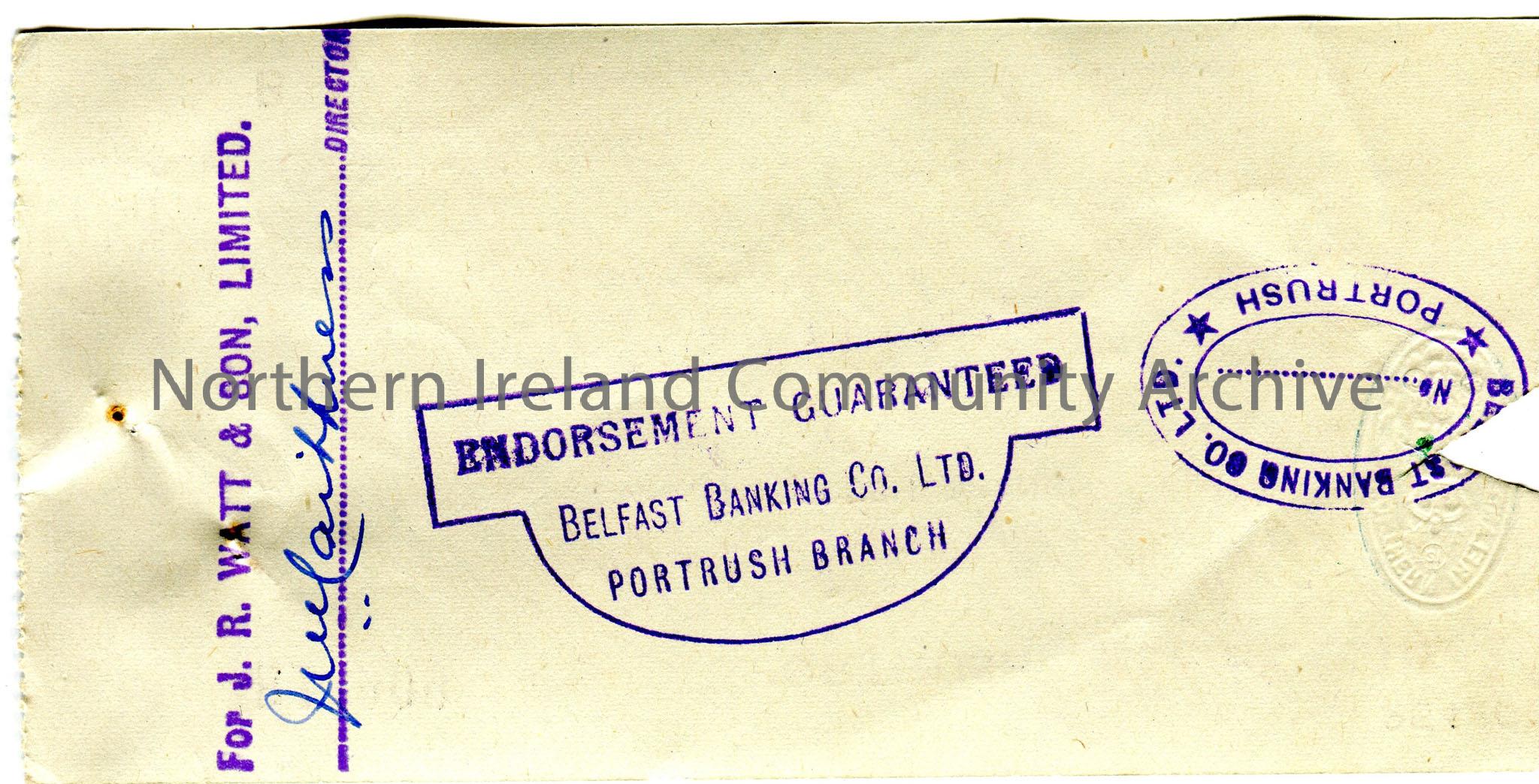 Handwritten Northern Bank Limited, Portrush branch cheque, no B14908. Payable to J. R. Watt & Son from Emily M. Hezlet for £0.9.6. Dated 4th July, 1946. W. J. Caithness, director of J. R. Watt & Son Limited signature on reverse along with Belfast Banking Co. Portrush branch stamps. Triangle cut out of edge of cheque.