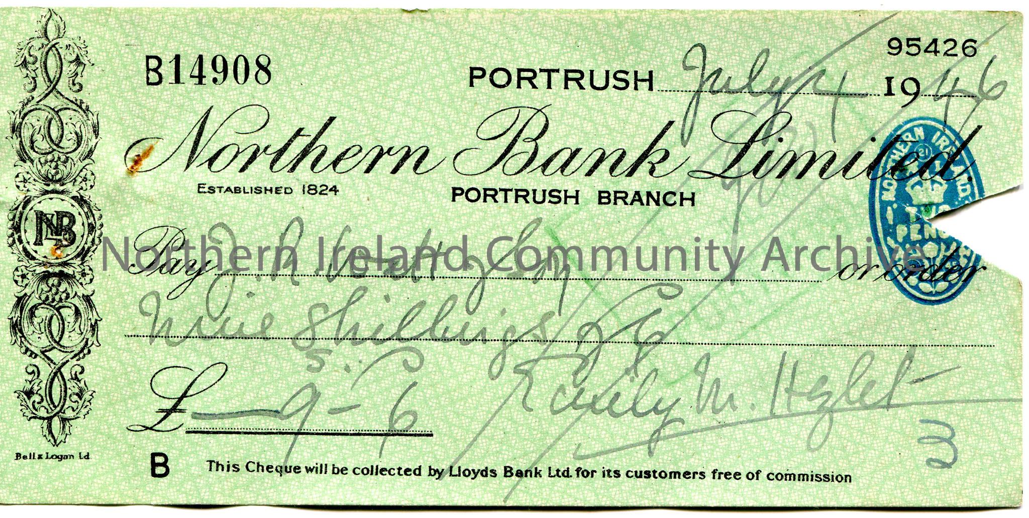 Handwritten Northern Bank Limited, Portrush branch cheque, no B14908. Payable to J. R. Watt & Son from Emily M. Hezlet for £0.9.6. Dated 4th July, 1946. W. J. Caithness, director of J. R. Watt & Son Limited signature on reverse along with Belfast Banking Co. Portrush branch stamps. Triangle cut out of edge of cheque.