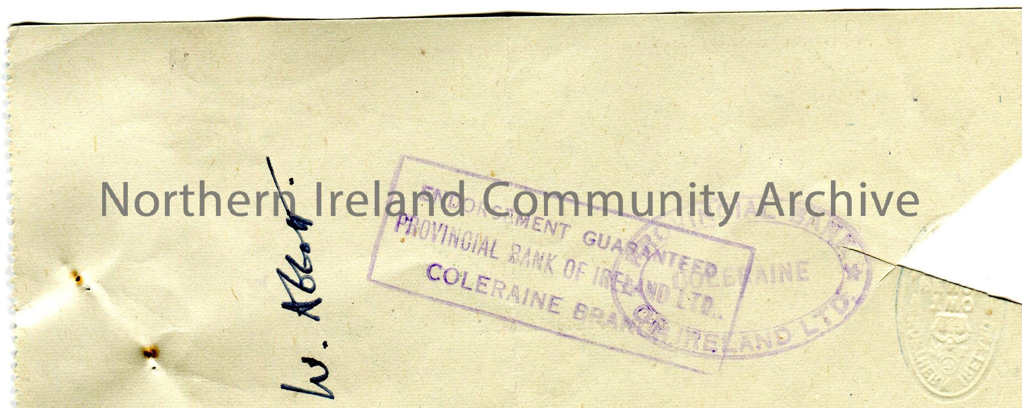 Handwritten Northern Bank Limited, Portrush branch cheque, no B14910. Payable to Rev W Abbott from Emily M. Hezlet for £8.0.0. Dated 3rd November, 1946. Paid stamp on front. W. Abbott signature on reverse along with Provincial Bank of Ireland, Coleraine branch stamps. Triangle cut out of edge of cheque.