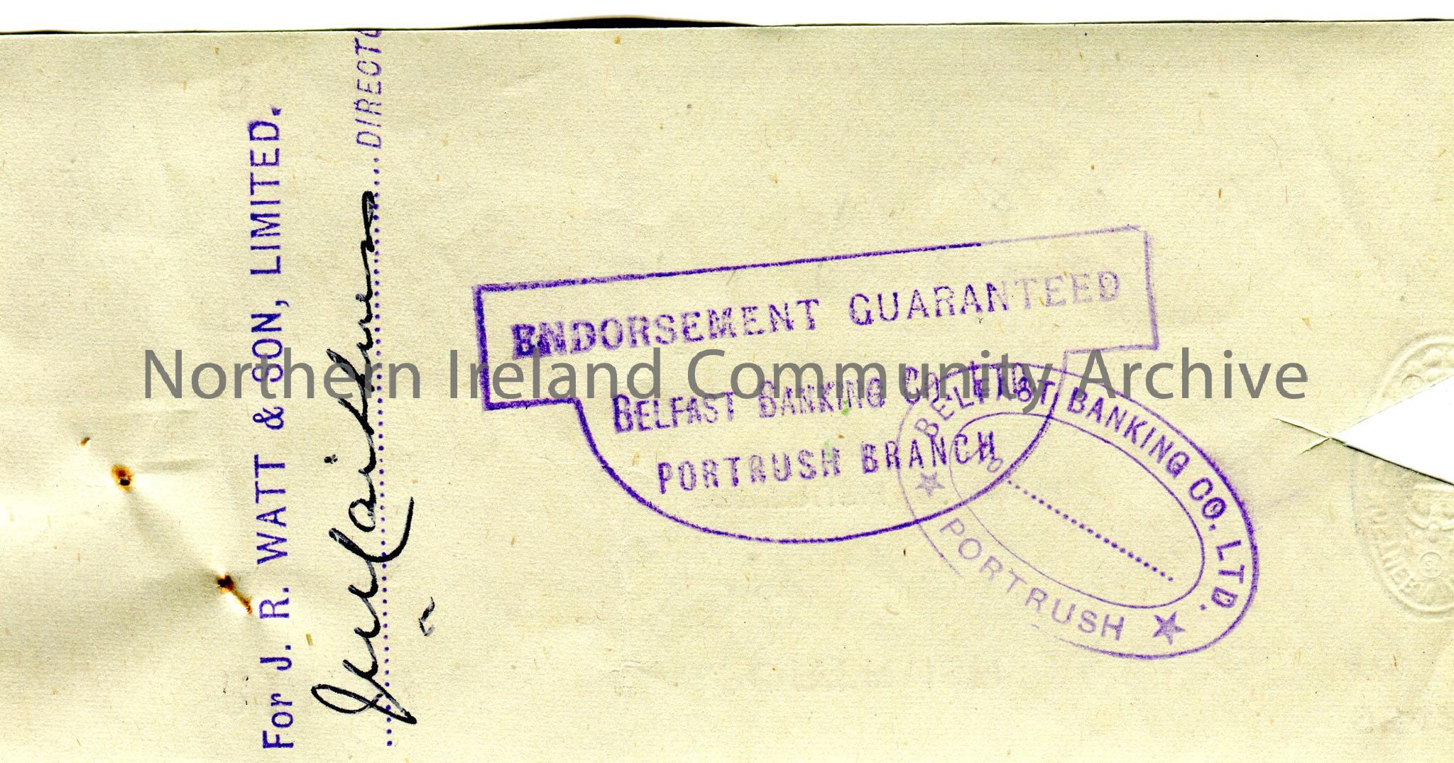 Handwritten Northern Bank Limited, Portrush branch cheque, no B14917. Payable to J. R. Watt & Son from Emily M. Hezlet for £0.10.10. Dated 5th July, 1947. ? Caithness, director for J. R. Watt & Son, Limited signature on reverse along with Belfast Banking Co. Ltd stamps. Triangle cut out of edge of cheque.