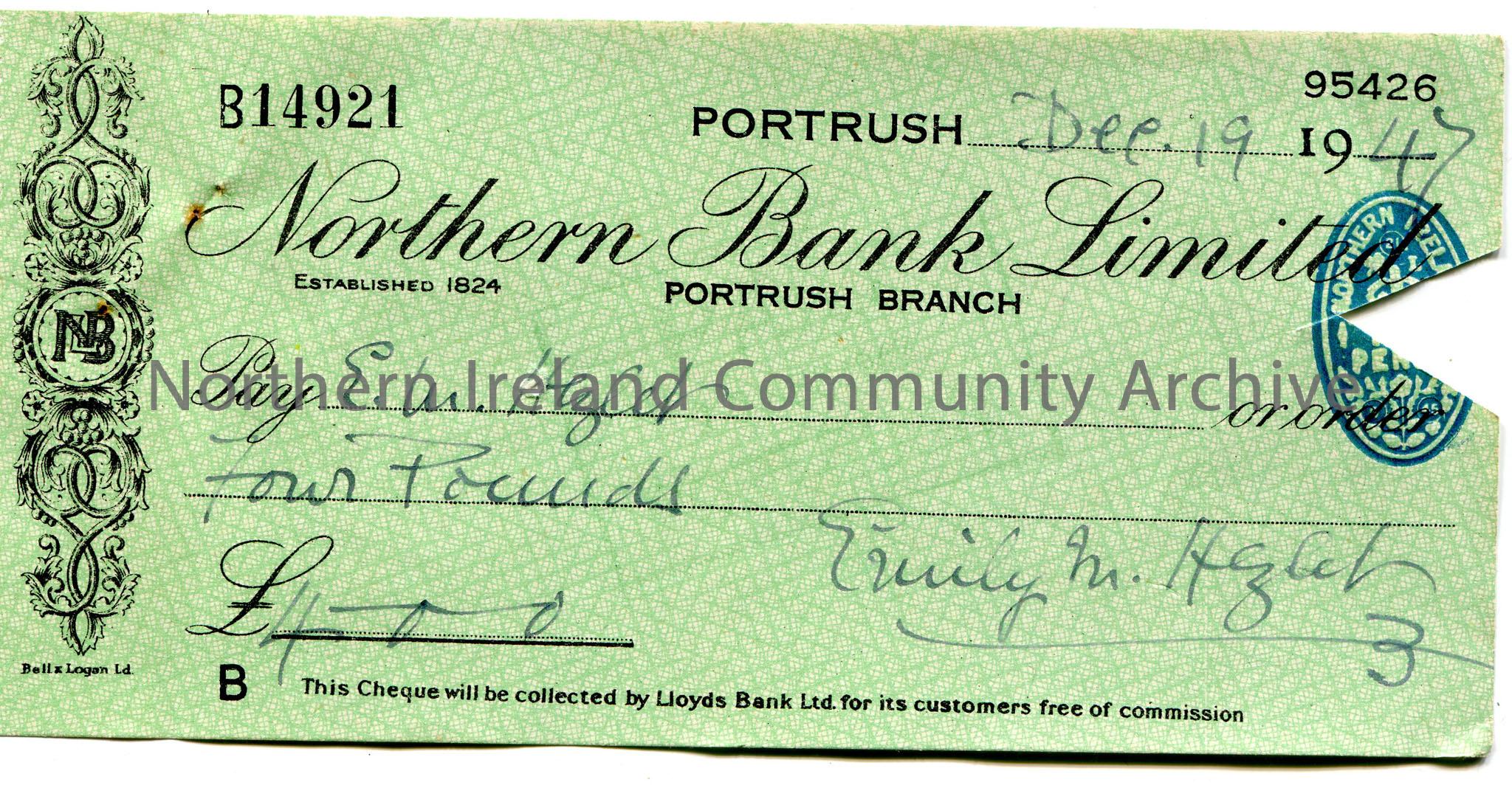 Handwritten Northern Bank Limited, Portrush branch cheque, no B14921. Payable to E. M. Hezlet from Emily M. Hezlet for £4.0.0. Dated 19th Decembe…
