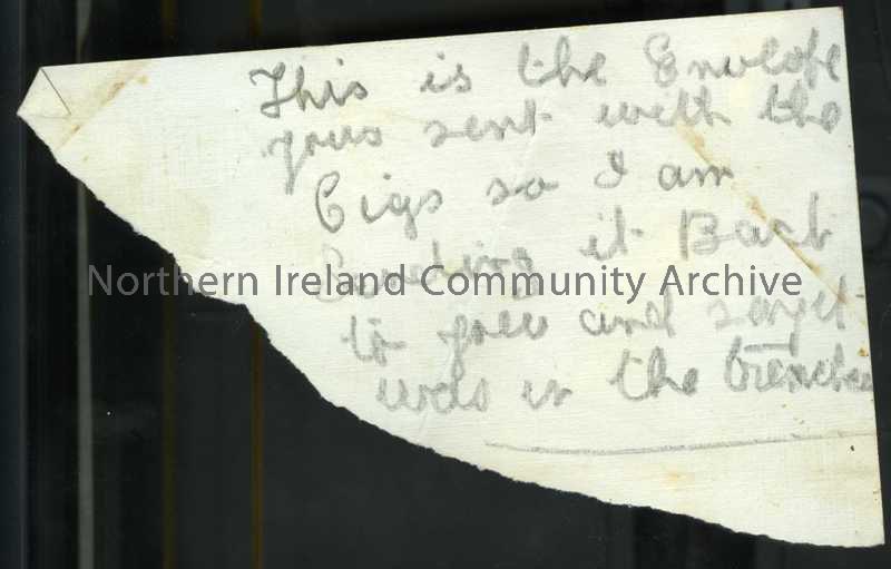 Handwritten note in pencil on torn scrap of paper accompanying small envelope sent from home and sent back again as souvenir of trenches. Small feathe…