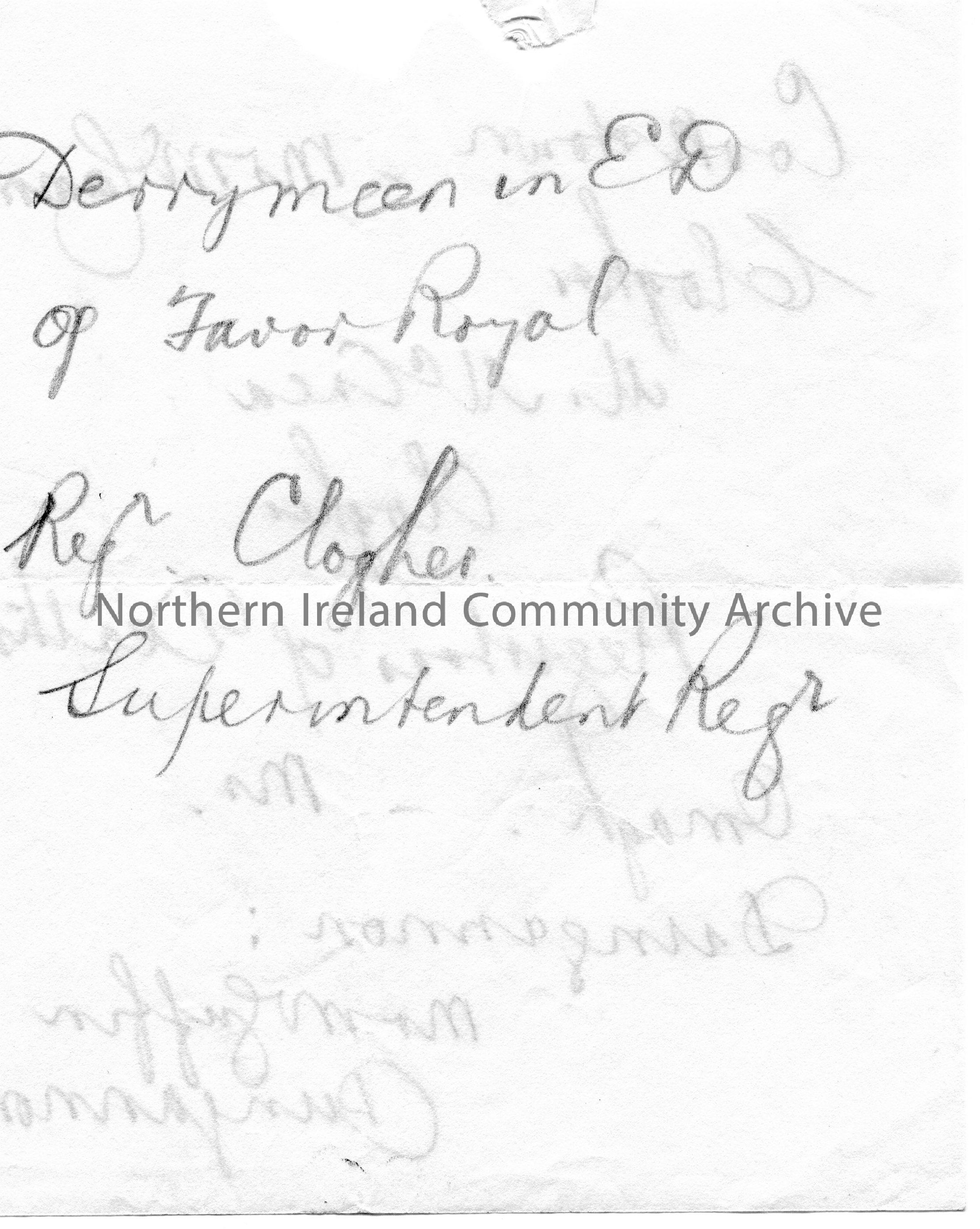 Handwritten note in pencil re Register of Deaths m Clogher. Mentions Omagh, Dungannon, Cookstown.