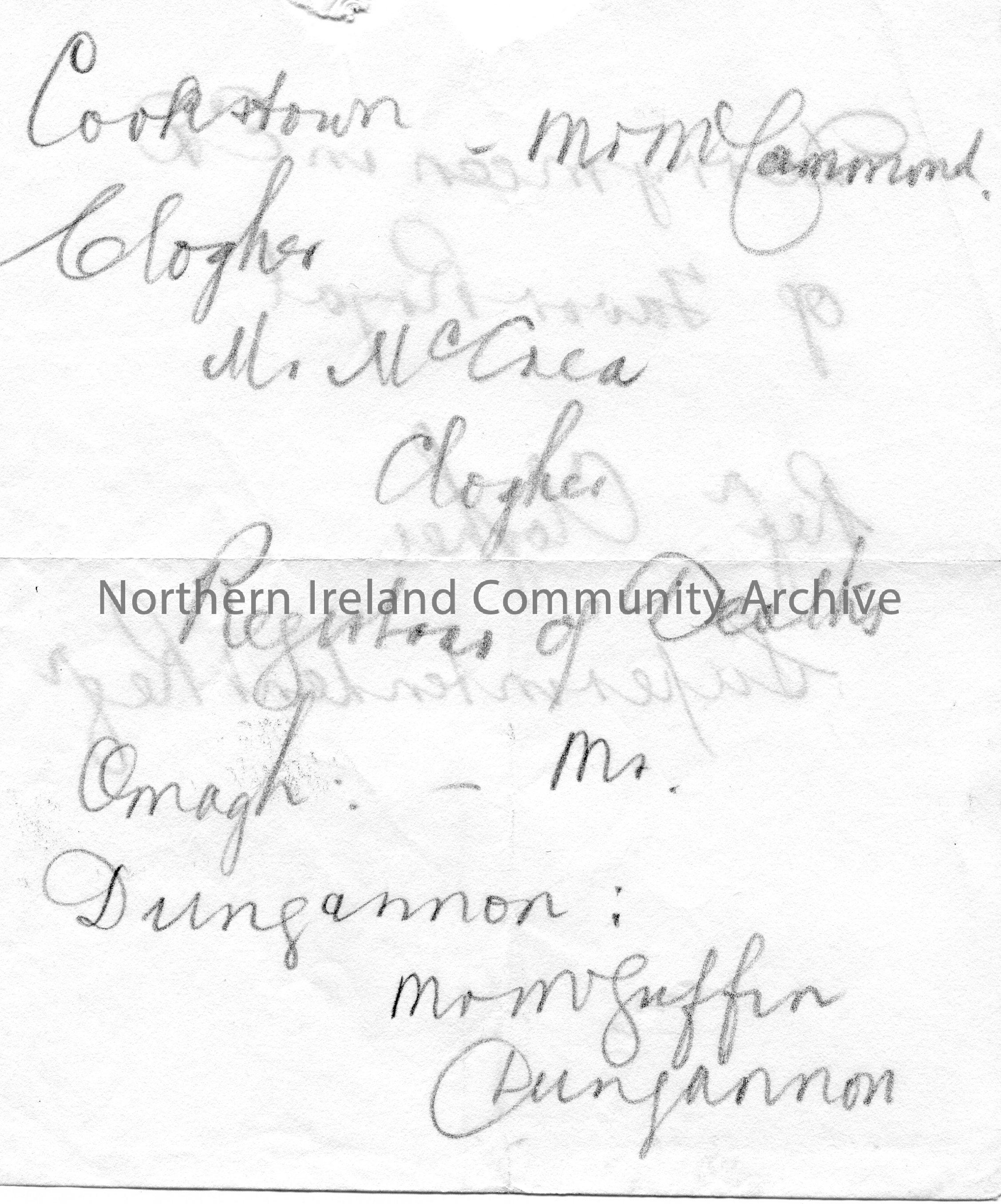 Handwritten note in pencil re Register of Deaths m Clogher. Mentions Omagh, Dungannon, Cookstown.