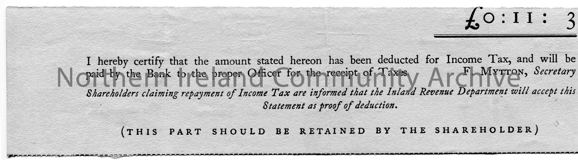Handwritten note on green slip of paper re Derrymeen. List of Counties, District of Union, Dispensary District and Electoral Division District. Handwritten on the back of an Income Tax slip.
