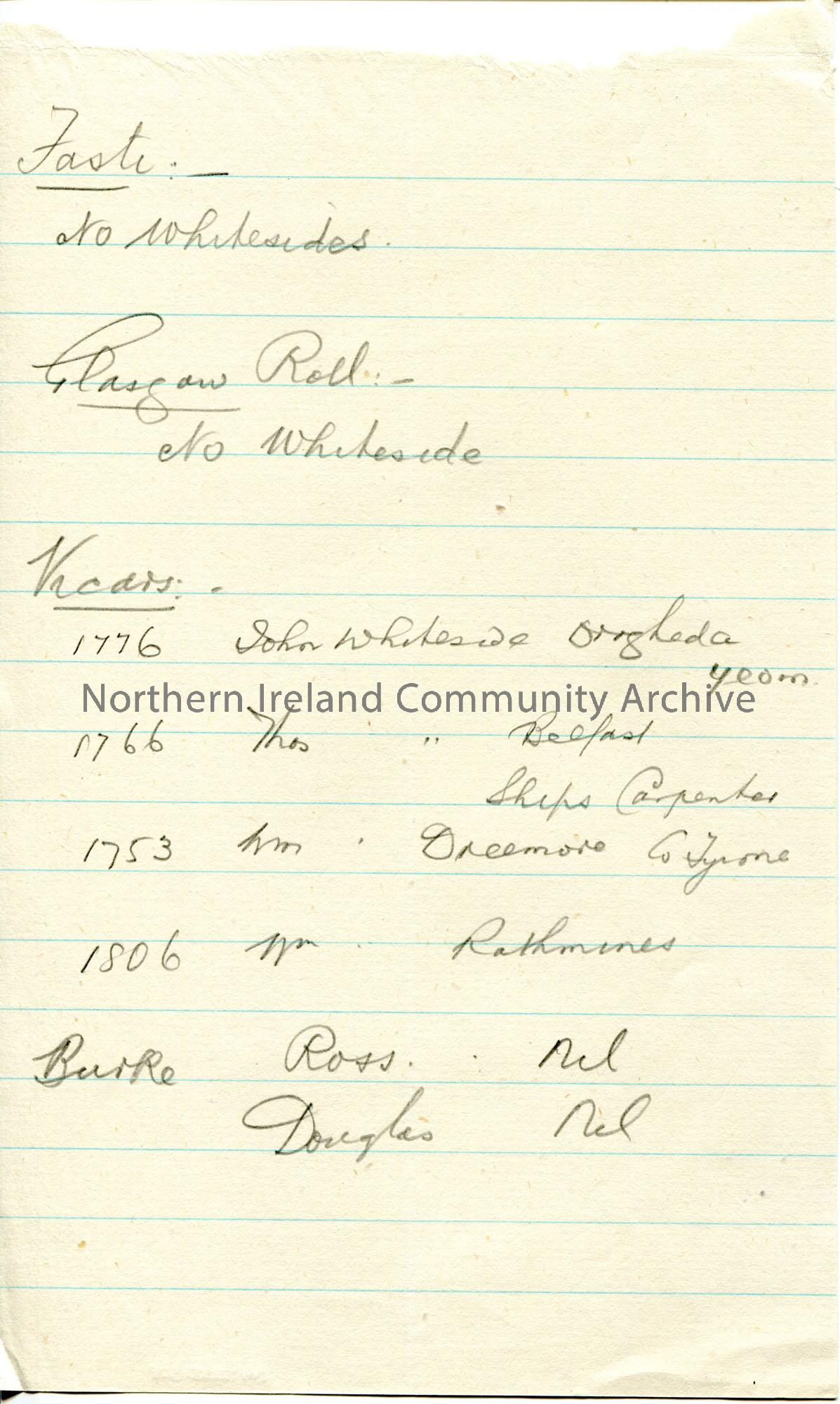 Handwritten note on lined paper re Sam’s genealogy research into the name Whiteside. Lists the names of vicars with the name Whiteside 1753-1806.
