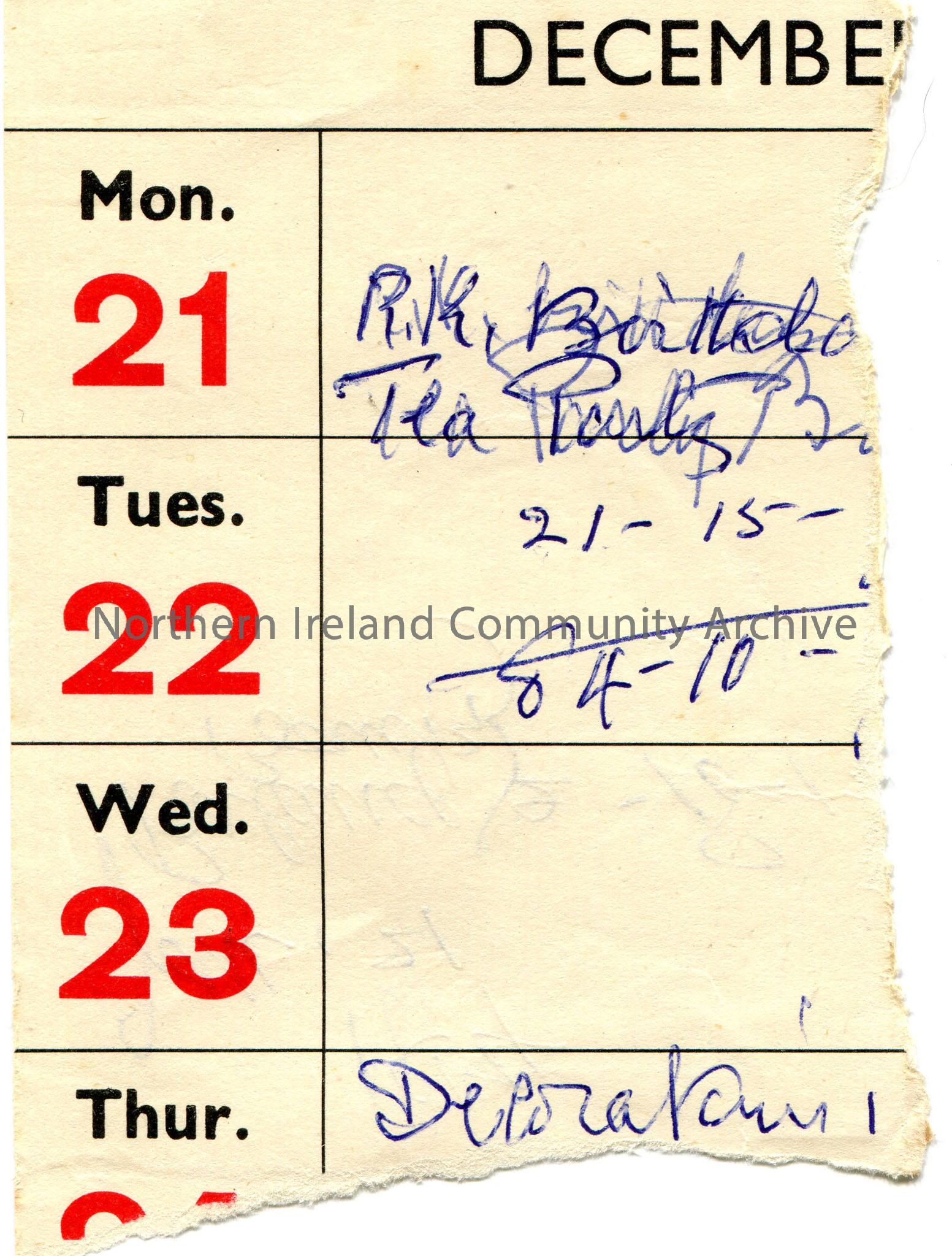 Handwritten note. Paper torn from a larger page. Note of a date - 21st January, 1954 and a bank balance of £2-18-1. Part of a calendar on one side for the month of December.