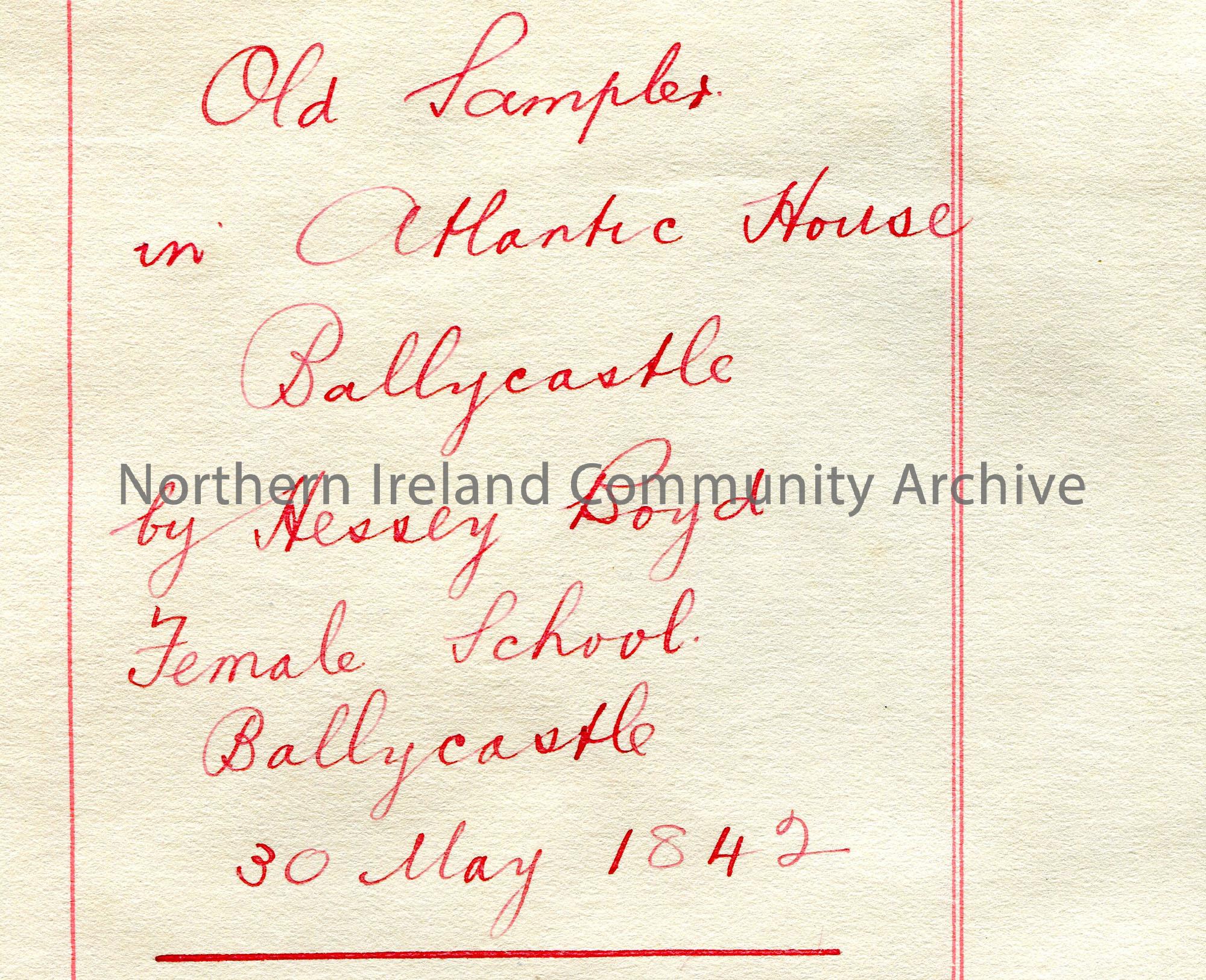 Handwritten note re Atlantic House, Ballycastle, Hessy Boyd, Female School, Ballycastle, 30th May 1842. Copy of poem by Sam Henry dated August 1917 re…