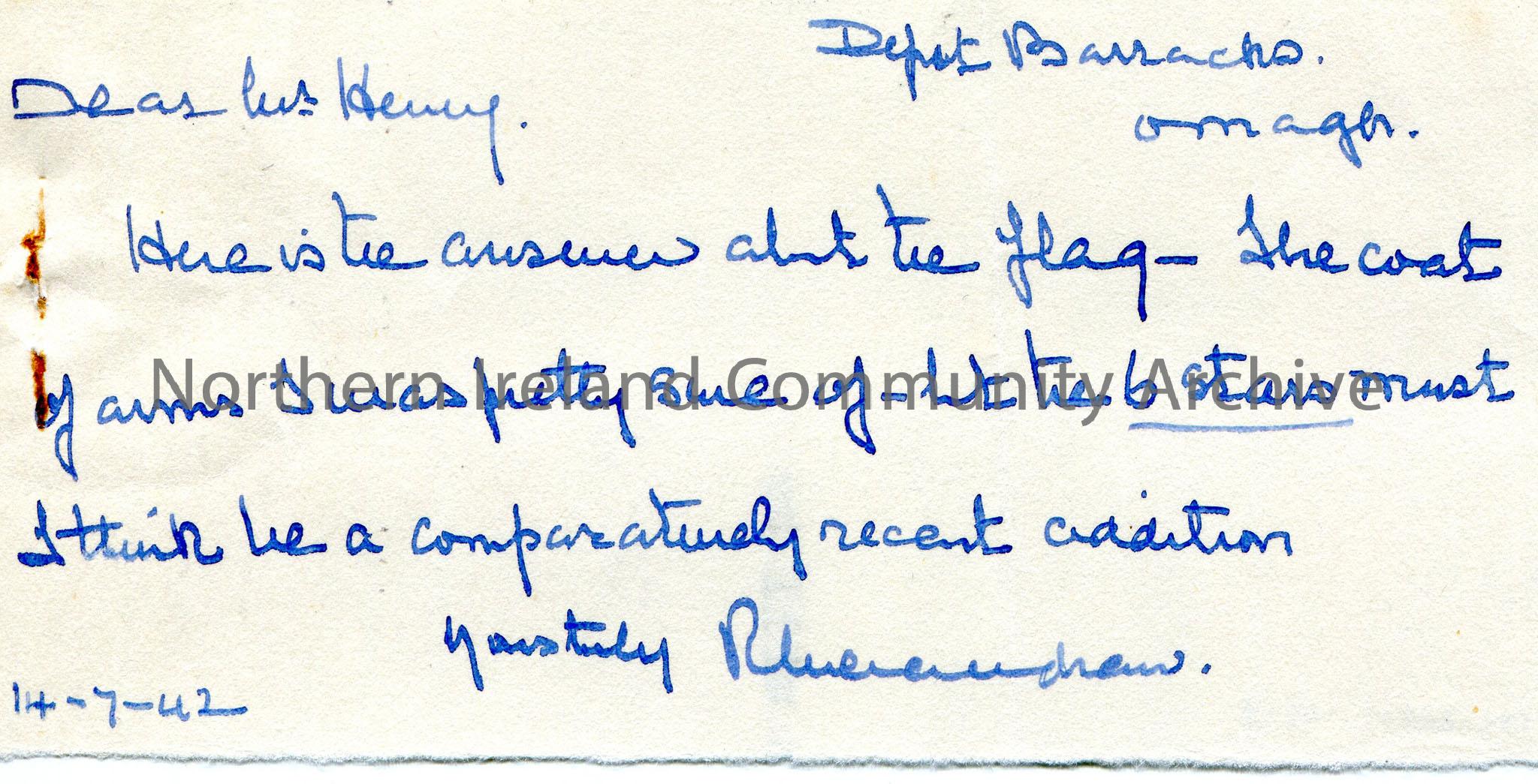 Handwritten note to Mr Henry. Appears to have been written on a piece of paper torn from a larger letter. Introduces the letter from S S Wilson and writes that the 6 stars on the official flag of Northern Ireland must have been added at a later date.