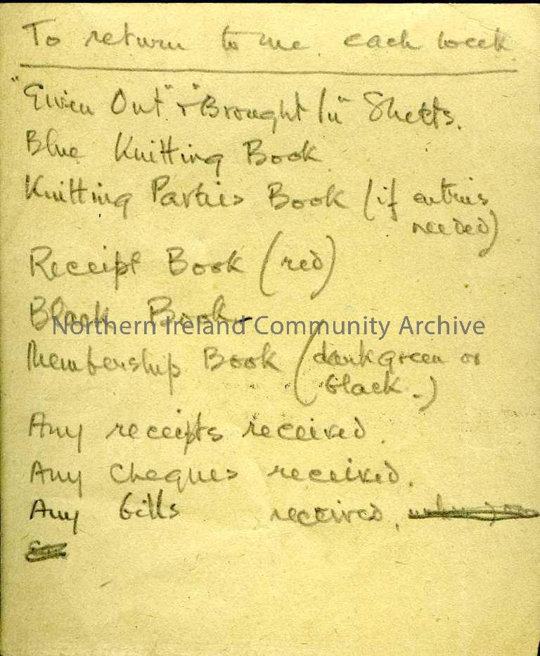 Handwritten note which lists items that are to be returned to the cash book. Lists includes 'given out' and 'brought in' sheets, blue knitting book, receipt book (red), membership book (dark green and black) and so on.