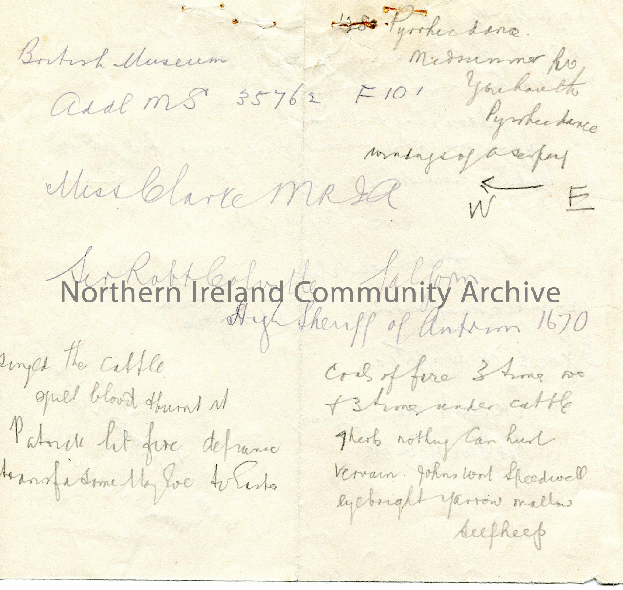 Handwritten notes (double sided) in pencil. Not in context. Mentions British Museu, Miss Clarke, Antrim, cattle, among others.
