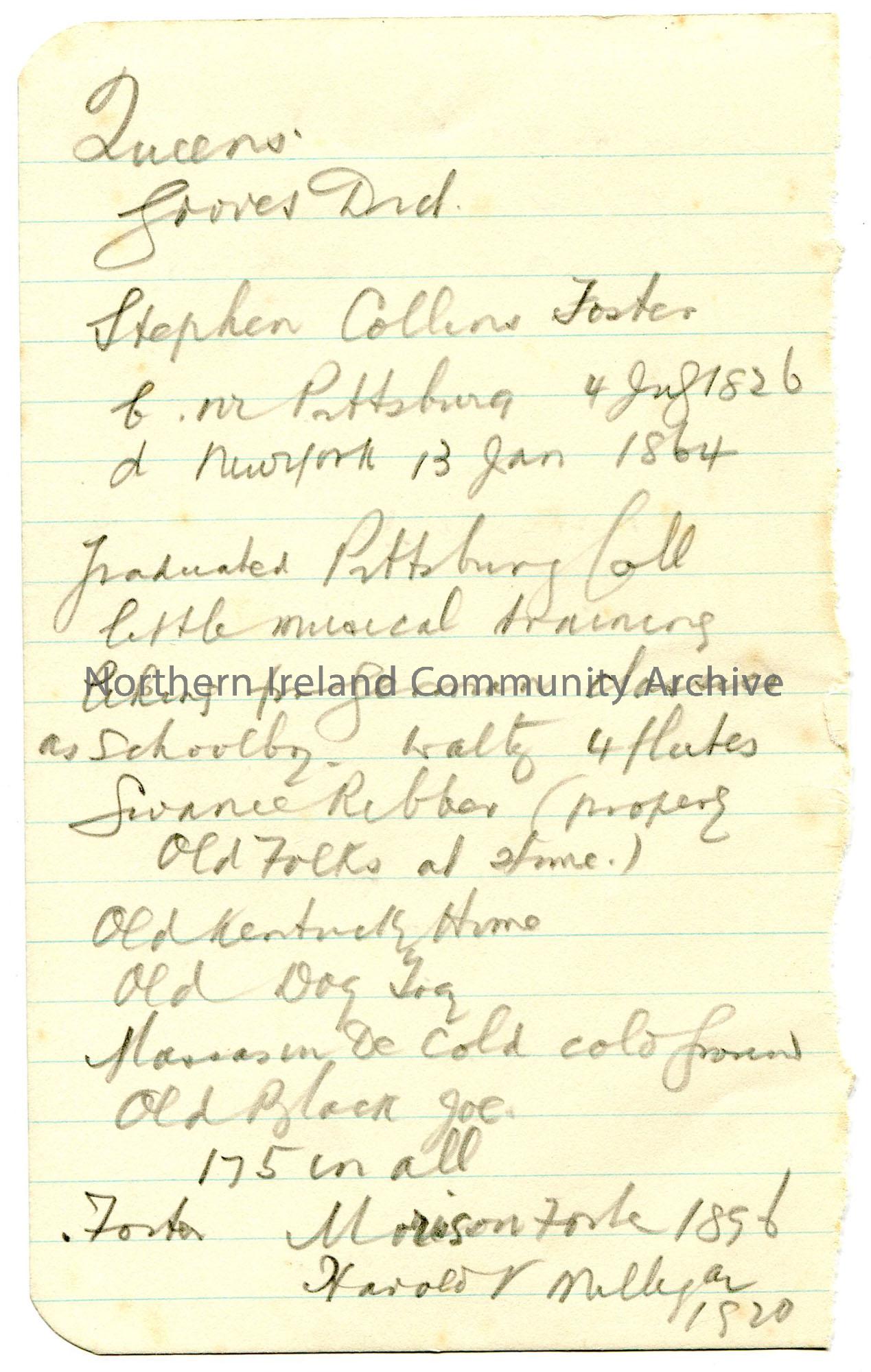 Handwritten notes (double sided) in pencil on lined paper. Front side mentions the Hearth Roll, Nicholson, Dungiven. Other side re Stephen Collins Foster 1826-1864, American musician.