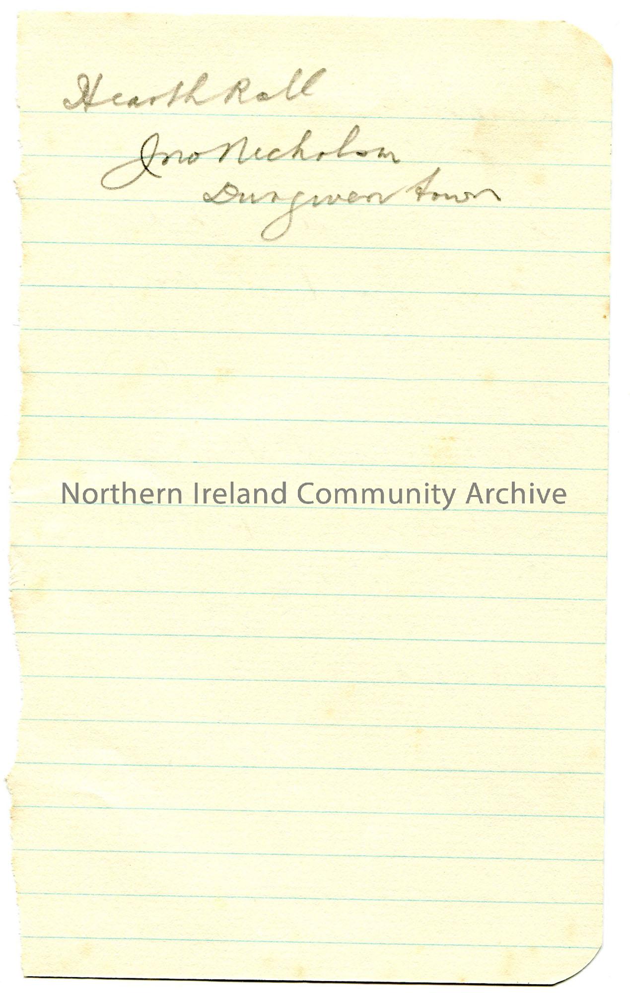 Handwritten notes (double sided) in pencil on lined paper. Front side mentions the Hearth Roll, Nicholson, Dungiven. Other side re Stephen Collins Fos…