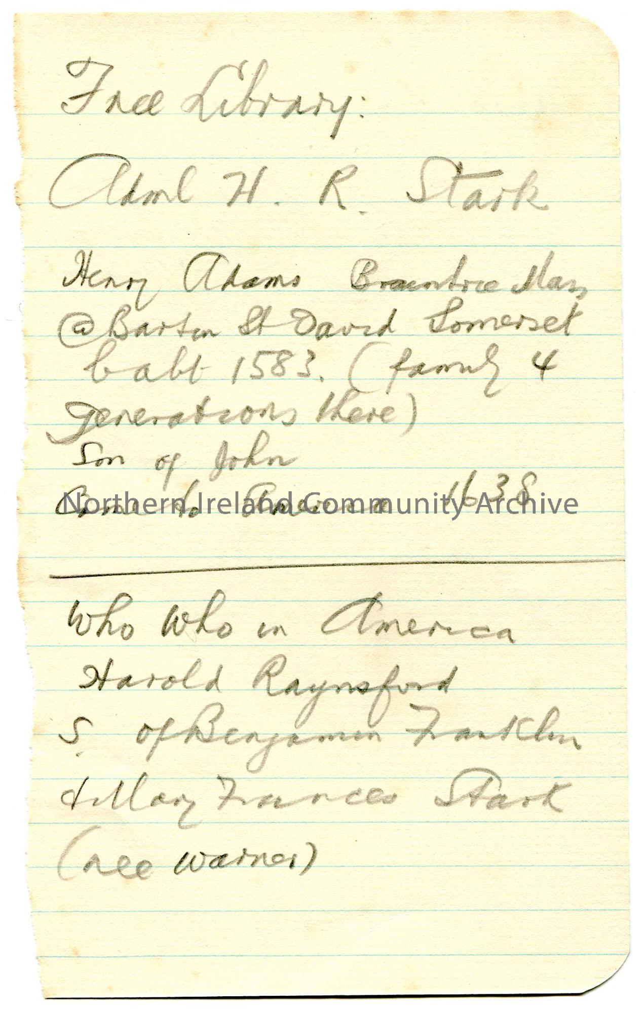 Handwritten notes (double sided) in pencil on lined paper. Genealogical information re Stark family.