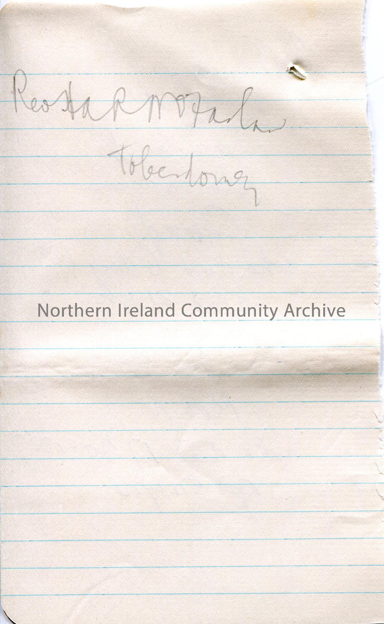 Handwritten notes (double sided) on lined page from a notebook. Appears to be a transcription of memorial to John Cochrane, Curragh who died 1887 and … – scan019b