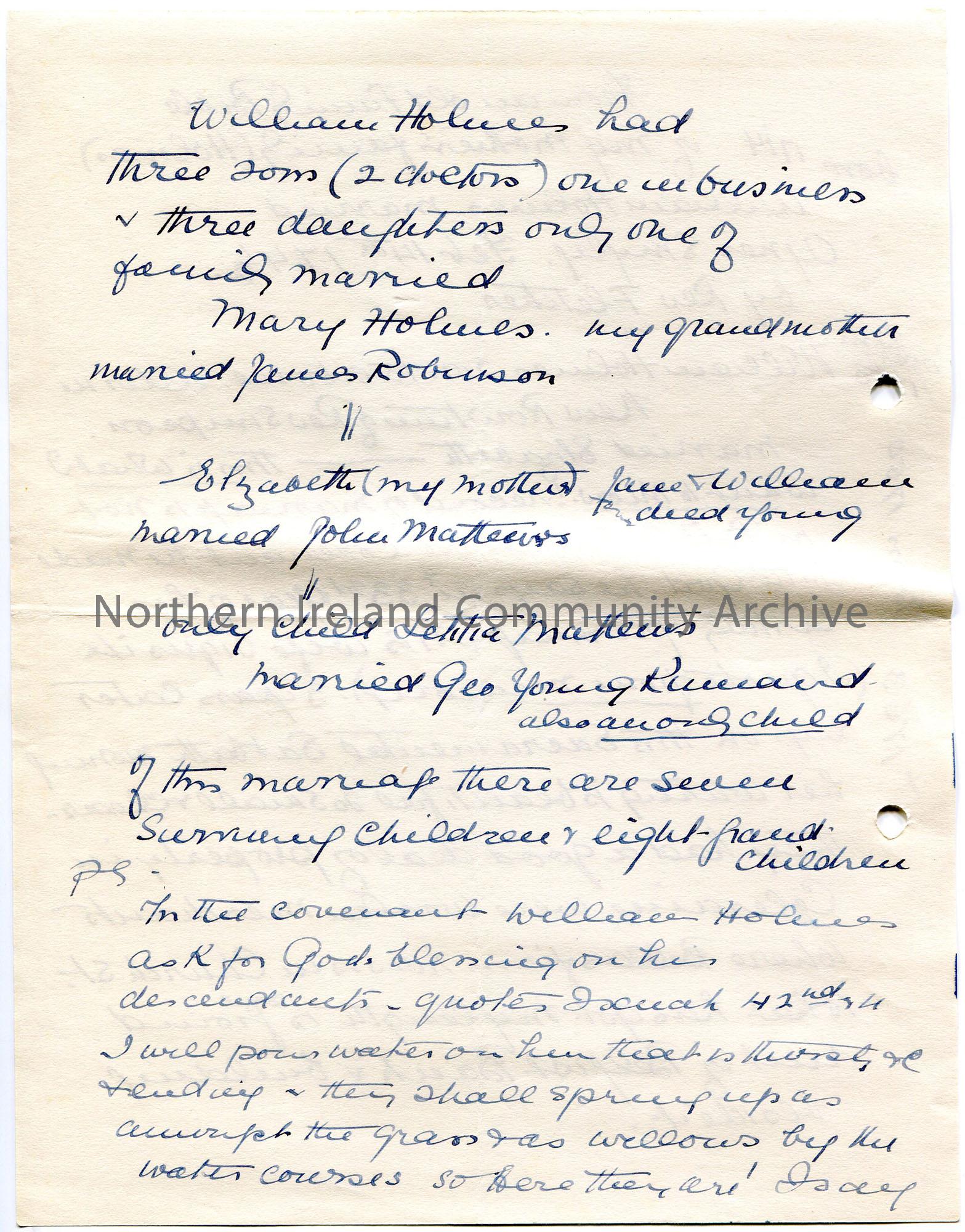 Handwritten notes (double sided) re genealogical information re the family name Holmes. They wish to find out the maiden name of a relative Elizabeth Holmes who married a William Holmes. Writes that they had property in Coleraine and were woollen merchants 'where Bellas firm now is in Church St'.