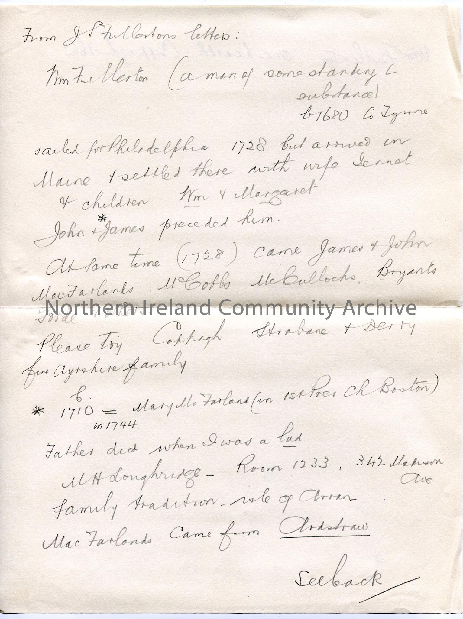 Handwritten notes 'from H S Fullerton letters' - rough summary of Fullerton family in 18th century - Ayrshire, Isle of Arran, Maine, Boston