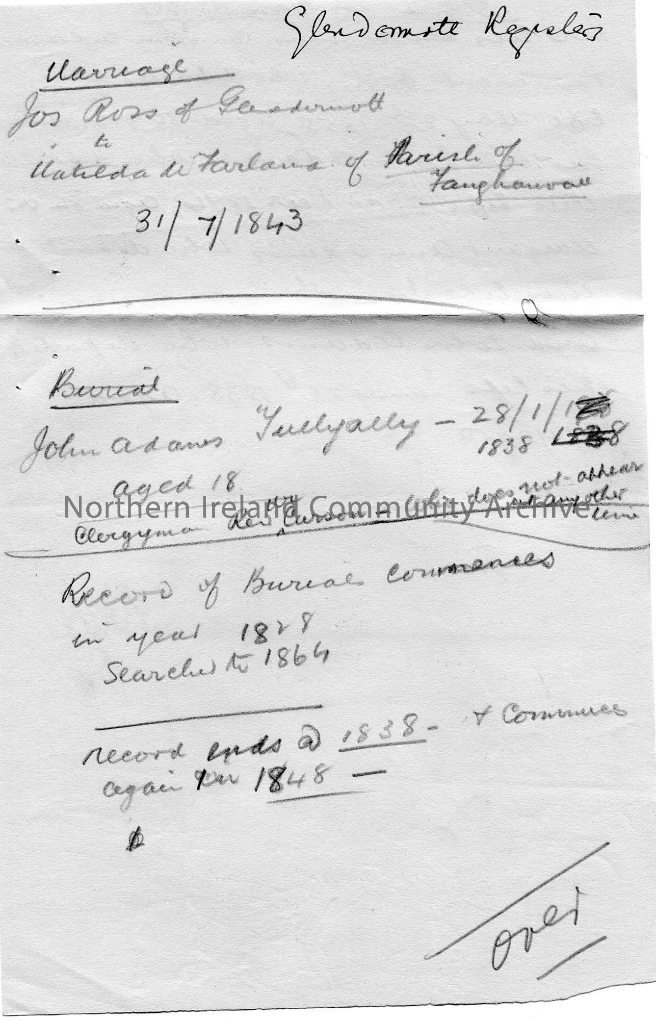 Handwritten notes in pencil from Glendermott Registers - marriage and burial. Marriage of ? Ross and Matilda McFarlane at Parish in Faughanvale. Burial of John Adams, Tullyally. Inscription from headstone in Glendermott of John Adams written on other side of page.