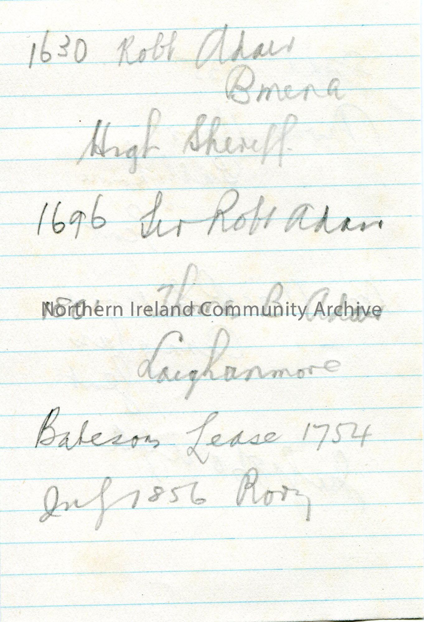 Handwritten notes in pencil. Mentions persons with surname Adair and Moore.
