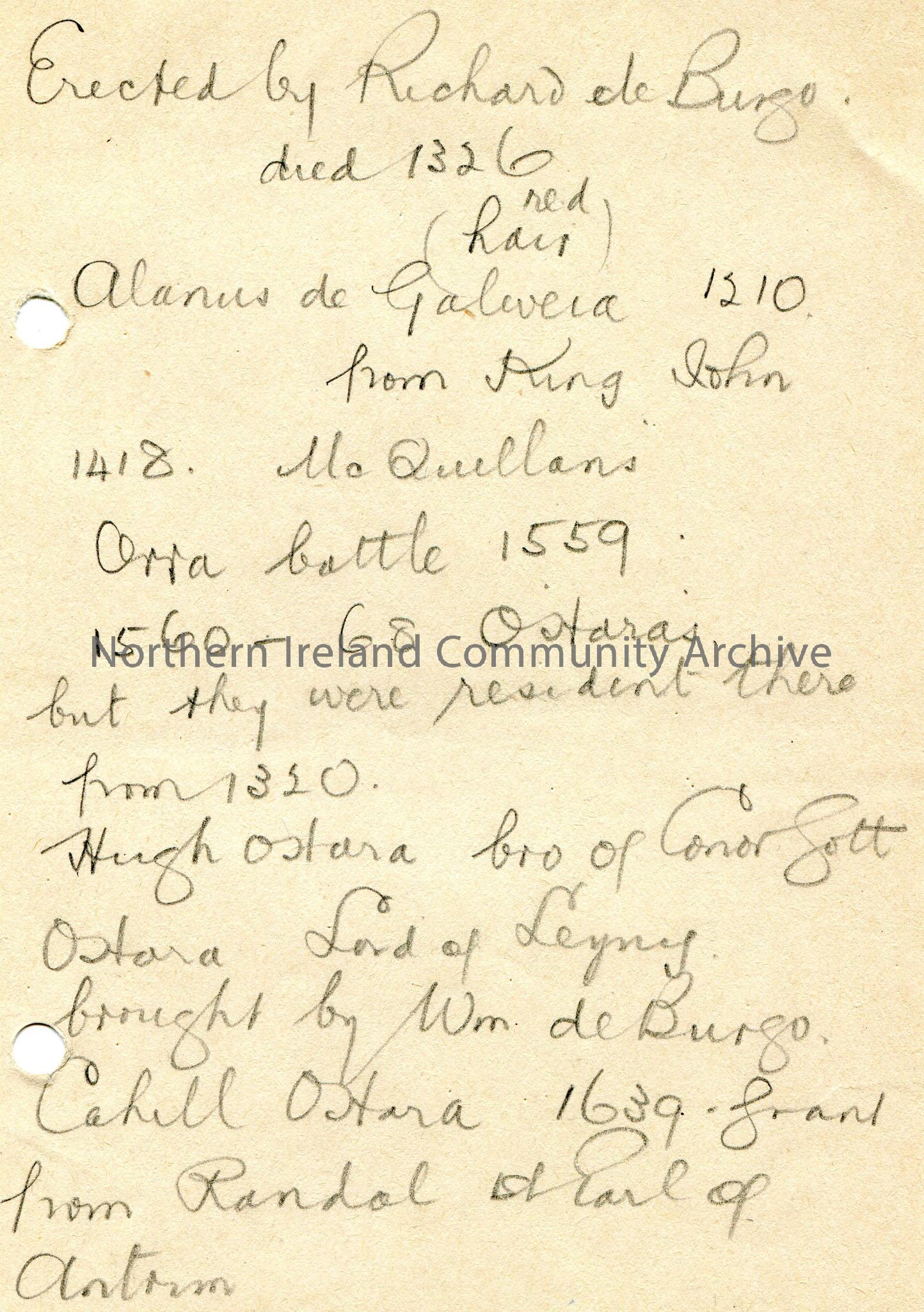 Handwritten notes in pencil. Mentions Richard de Burgo, McQuillan, O’Hara, William de Burgo.