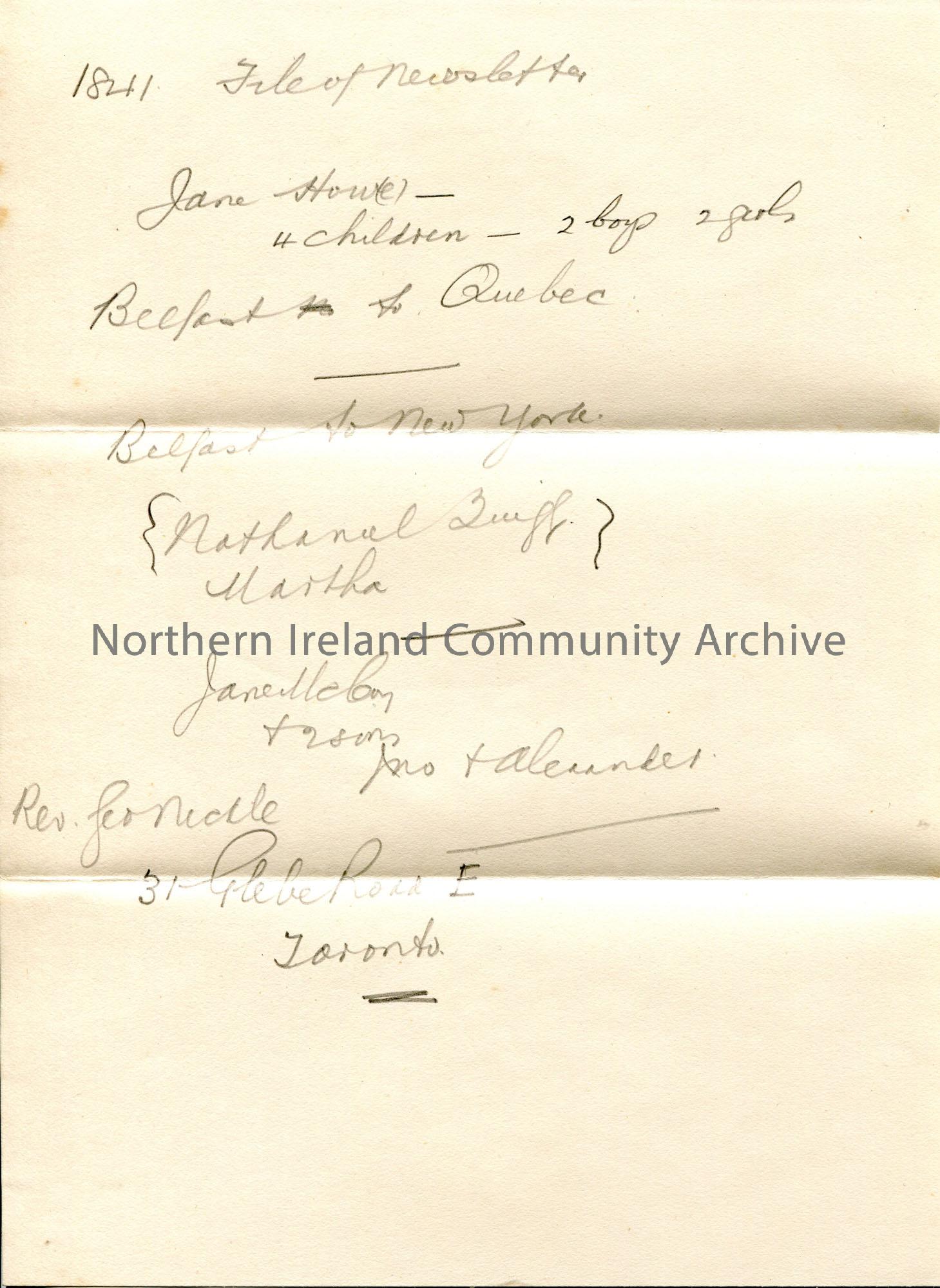 Handwritten notes in pencil. Not in context. Mentions 1841 File of Newsletter; Jane Howe; Belfast to Quebec; Belfast to New York; Rev. Geo. Nickle of Toronto.